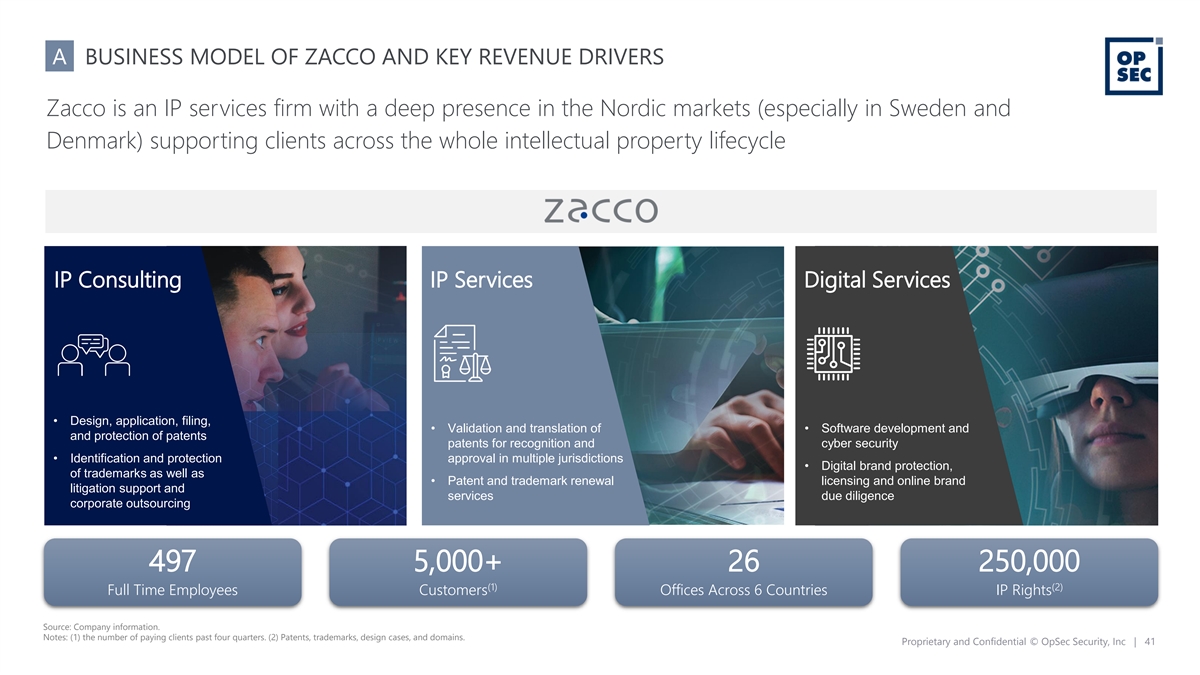 A BUSINESS MODEL OF ZACCO AND KEY REVENUE DRIVERS Zacco is an IP services firm with a deep presence in the Nordic markets (especially in Sweden and Denmark) supporting clients across the whole intellectual property lifecycle IP Consulting IP Services Digital Services • Design, application, filing, • Validation and translation of • Software development and and protection of patents patents for recognition and cyber security • Identification and protection approval in multiple jurisdictions • Digital brand protection, of trademarks as well as • Patent and trademark renewal licensing and online brand litigation support and services due diligence corporate outsourcing 497 5,000+ 26 250,000 (1) (2) Full Time Employees Customers Offices Across 6 Countries IP Rights Source: Company information. Notes: (1) the number of paying clients past four quarters. (2) Patents, trademarks, design cases, and domains. Proprietary and Confidential © OpSec Security, Inc | 41