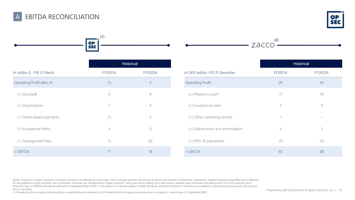 A EBITDA RECONCILIATION (1) (2) Historical Historical In million $ , FYE 31 March FY2021A FY2022A In DKK million, FYE 31 December FY2021A FY2022A Operating Profit after JV (1) 4 Operating Profit 20 45 (3) (+) Goodwill 6 8 (+) Platform costs 17 10 (+) Depreciation 7 6 (+) Exceptional costs 3 5 (+) Share-based payments (1) 0 (+) Other operating income 1 -- (+) Exceptional items 4 0 (+) Depreciation and amortization 4 3 (+) Management fees 0 (0) (+) IFRS-16 adjustment 20 24 = EBITDA 17 18 = EBITDA 65 88 Notes: Financials of OpSec Solutions and Zacco Solutions are affected by seasonality. Their strongest quarters are January to March and October to December respectively. Audited financials may differ due to different FX rate applied for audit purposes. Zacco Solutions’ financials are calendarized to OpSec Solutions’ fiscal year end by taking 1/4 of the current calendar year’s financials and adding back 3/4 of the previous year’s financials. Zacco’s EBITDA includes an add-back of capitalised R&D, which is still subject to review by auditors. OpSec Solutions’ and Zacco Solutions’ numbers are rounded for presentation purpose and may not sum due to rounding. Proprietary and Confidential © OpSec Security, Inc | 42 (1) Provided by the company and reconciling to audited financial statements. (2) Provided by the company and reconciling to company’s internal data. (3) Capitalised R&D.