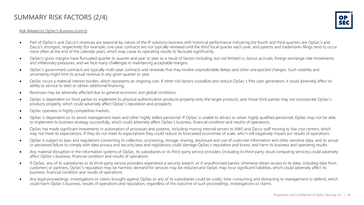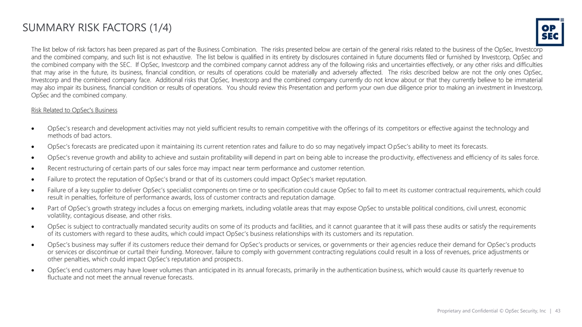 SUMMARY RISK FACTORS (1/4) The list below of risk factors has been prepared as part of the Business Combination. The risks presented below are certain of the general risks related to the business of the OpSec, Investcorp and the combined company, and such list is not exhaustive. The list below is qualified in its entirety by disclosures contained in future documents filed or furnished by Investcorp, OpSec and the combined company with the SEC. If OpSec, Investcorp and the combined company cannot address any of the following risks and uncertainties effectively, or any other risks and difficulties that may arise in the future, its business, financial condition, or results of operations could be materially and adversely affected. The risks described below are not the only ones OpSec, Investcorp and the combined company face. Additional risks that OpSec, Investcorp and the combined company currently do not know about or that they currently believe to be immaterial may also impair its business, financial condition or results of operations. You should review this Presentation and perform your own due diligence prior to making an investment in Investcorp, OpSec and the combined company. Risk Related to OpSec's Business • OpSec’s research and development activities may not yield sufficient results to remain competitive with the offerings of its competitors or effective against the technology and methods of bad actors. • OpSec’s forecasts are predicated upon it maintaining its current retention rates and failure to do so may negatively impact O pSec’s ability to meet its forecasts. • OpSec’s revenue growth and ability to achieve and sustain profitability will depend in part on being able to increase the pro ductivity, effectiveness and efficiency of its sales force. • Recent restructuring of certain parts of our sales force may impact near term performance and customer retention. • Failure to protect the reputation of OpSec’s brand or that of its customers could impact OpSec’s market reputation. • Failure of a key supplier to deliver OpSec’s specialist components on time or to specification could cause OpSec to fail to meet its customer contractual requirements, which could result in penalties, forfeiture of performance awards, loss of customer contracts and reputation damage. • Part of OpSec’s growth strategy includes a focus on emerging markets, including volatile areas that may expose OpSec to unsta ble political conditions, civil unrest, economic volatility, contagious disease, and other risks. • OpSec is subject to contractually mandated security audits on some of its products and facilities, and it cannot guarantee th at it will pass these audits or satisfy the requirements of its customers with regard to these audits, which could impact OpSec’s business relationships with its customers and its reputation. • OpSec’s business may suffer if its customers reduce their demand for OpSec’s products or services, or governments or their ag encies reduce their demand for OpSec’s products or services or discontinue or curtail their funding. Moreover, failure to comply with government contracting regulations coul d result in a loss of revenues, price adjustments or other penalties, which could impact OpSec’s reputation and prospects. • OpSec’s end customers may have lower volumes than anticipated in its annual forecasts, primarily in the authentication business, which would cause its quarterly revenue to fluctuate and not meet the annual revenue forecasts. Proprietary and Confidential © OpSec Security, Inc | 43