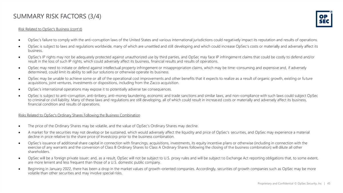 SUMMARY RISK FACTORS (2/4) Risk Related to OpSec's Business (cont’d) • Part of OpSec’s and Zacco’s revenues are seasonal by nature of the IP solutions business with historical performance indicating the fourth and third quarters are OpSec’s and Zacco’s strongest, respectively (for example, one-year contracts are not typically renewed until the third fiscal quarter each year, and patents and trademarks filings tend to occur more often at the end of the calendar year), which may cause its operating results to fluctuate significantly. • OpSec’s gross margins have fluctuated quarter to quarter and year to year as a result of factors including, but not limited t o, bonus accruals, foreign exchange rate movements and inflationary pressures, and we face many challenges in maintaining acceptable margins. • OpSec’s government contracts are typically multi-year contracts and renewals that may involve unpredictable delays and other unexpected changes. Such volatility and uncertainty might limit its actual revenue in any given quarter or year. • OpSec incurs a material interest burden, which represents an ongoing cost. If other risk factors crystallize and reduce OpSec ’s free cash generation, it could adversely affect its ability to service its debt or obtain additional financing. • Revenues may be adversely affected due to general economic and global conditions. • OpSec is dependent on third parties to implement its physical authentication products properly onto the target products, and those third parties may not incorporate OpSec’s products properly, which could adversely affect OpSec’s reputation and prospects. • OpSec operates in highly competitive markets. • OpSec is dependent on its senior management team and other highly skilled personnel. If OpSec is unable to attract or retain highly qualified personnel, OpSec may not be able to implement its business strategy successfully, which could adversely affect OpSec’s business, financial condition and results of operations. • OpSec has made significant investments in automation of processes and systems, including moving internal servers to AWS and Zacco staff moving to low cost centers, which may not meet its expectations. If they do not meet its expectations they could reduce its forecasted economies of scale, whic h will negatively impact our results of operations. • OpSec is subject to laws and regulations concerning its collection, processing, storage, sharing, disclosure and use of custo mer information and other sensitive data, and its actual or perceived failure to comply with data privacy and security laws and regulations could damage OpSec’s reputation and brand and harm its business and operating results. • Any material disruption in the information systems of OpSec, its subsidiaries or its third-party service providers (including its third-party cloud computing services) could adversely affect OpSec’s business, financial condition and results of operations. • If OpSec, any of its subsidiaries or its third-party service providers experience a security breach, or if unauthorized parties otherwise obtain access to its data, including data from customers or partners, OpSec’s reputation may be harmed, demand for services may be reduced and OpSec may incur significant l iabilities, which could adversely affect its business, financial condition and results of operations. • Any legal proceedings, investigations or claims brought against OpSec or any of its subsidiaries could be costly, time-consuming and distracting to management to defend, which could harm OpSec’s business, results of operations and reputation, regardless of the outcome of such proceedings, investigati ons or claims. Proprietary and Confidential © OpSec Security, Inc | 44