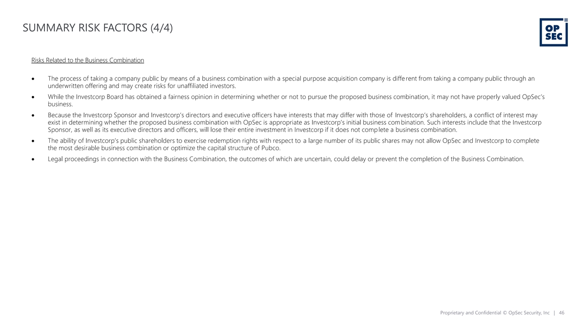 SUMMARY RISK FACTORS (3/4) Risk Related to OpSec's Business (cont’d) • OpSec’s failure to comply with the anti-corruption laws of the United States and various international jurisdictions could negatively impact its reputation and results of operations. • OpSec is subject to laws and regulations worldwide, many of which are unsettled and still developing and which could increase OpSec’s costs or materially and adversely affect its business. • OpSec’s IP rights may not be adequately protected against unauthorized use by third parties, and OpSec may face IP infringeme nt claims that could be costly to defend and/or result in the loss of such IP rights, which could adversely affect its business, financial results and results of operations. • OpSec may need to initiate or defend against intellectual property infringement or misappropriation claims, which may be time-consuming and expensive and, if adversely determined, could limit its ability to sell our solutions or otherwise operate its business. • OpSec may be unable to achieve some or all of the operational cost improvements and other benefits that it expects to realize as a result of organic growth, existing or future acquisitions, joint ventures, investments or dispositions, including from the Zacco acquisition. • OpSec’s international operations may expose it to potentially adverse tax consequences. • OpSec is subject to anti-corruption, anti-bribery, anti-money laundering, economic and trade sanctions and similar laws, and non-compliance with such laws could subject OpSec to criminal or civil liability. Many of these laws and regulations are still developing, all of which could result in increas ed costs or materially and adversely affect its business, financial condition and results of operations. Risks Related to OpSec's Ordinary Shares Following the Business Combination • The price of the Ordinary Shares may be volatile, and the value of OpSec’s Ordinary Shares may decline. • A market for the securities may not develop or be sustained, which would adversely affect the liquidity and price of OpSec’s securities, and OpSec may experience a material decline in price relative to the share price of Investcorp prior to the business combination. • OpSec’s issuance of additional share capital in connection with financings, acquisitions, investments, its equity incentive plans or otherwise (including in connection with the exercise of any warrants and the conversion of Class B Ordinary Shares to Class A Ordinary Shares following the closing of th e business combination) will dilute all other shareholders. • OpSec will be a foreign private issuer; and, as a result, OpSec will not be subject to U.S. proxy rules and will be subject t o Exchange Act reporting obligations that, to some extent, are more lenient and less frequent than those of a U.S. domestic public company. • Beginning in January 2022, there has been a drop in the market values of growth-oriented companies. Accordingly, securities of growth companies such as OpSec may be more volatile than other securities and may involve special risks. Proprietary and Confidential © OpSec Security, Inc | 45
