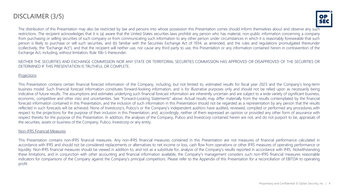 DISCLAIMER (2/5) For example, statements concerning the following include forward-looking statements: (i) the expected timing and likelihood of completion of the proposed Business Combination, including the risk that the proposed Business Combination may not close due to one or more closing conditions to the proposed Business Combination in the business combination agreement (the “Business Combination Agreement”) not being satisfied or waived on a timely basis or otherwise, or that the required approval of the Business Combination Agreement and related matters by the shareholders of Investcorp may not be obtained; (ii) Investcorp’s potential failure to raise sufficient funds in one or more equity financings so as to meet the closing condition under the Business Combination Agreement that requires it to have $50 million of funds (including funds in its trust account, after deducing any amounts paid out for redemptions by Investcorp shareholders) as of the closing; (iii) the potential inability of Pubco to meet the initial listing standards of the applicable stock exchange following the proposed Business Combination, including due to excessive redemptions of Investcorp’s public shares; (iv) costs related to the proposed Business Combination; (v) the potential occurrence of a material adverse change with respect to the financial position, performance, operations or prospects of the Company, Pubco or Investcorp; (vi) the potential disruption of Company management’s time from ongoing business operations due to the proposed Business Combination; (vii) announcements relating to the proposed Business Combination potentially having an adverse effect on the market price of Investcorp’s securities; (viii) the potential effect of the proposed Business Combination and the announcement thereof on the ability of the Company to retain customers and hire key personnel and maintain relationships with its customers and suppliers and on its operating results and business generally; (ix) risks relating to the growth of the Company’s business and its ability to realize expected results; (x) risks relating to the Company’s plans for targeted acquisitions and upscaling organically; (xi) risks relating to the growth and expansion of the Company’s portfolio of solutions; (xii) risks relating to the viability of the Company’s growth strategy, including related capabilities; (xiii) risks relating to trends and developments in the IP/brand optimization, monetization and protection industry; (xiv) the risk that the combined company may be adversely affect by other economic, business, and/or competitive factors, or adverse macroeconomic conditions, including inflation, supply chain delays and increasing interest rates; (xv) variances between the historical financial information the Company presents and its PCAOB audited financial statements for 2022 which may be significant when they become available; and (xvi) other risks and uncertainties, including those identified in any proxy statement/prospectus in a Registration Statement on Form F-4 relating to the proposed Business Combination (which is expected to be filed by Pubco with the Securities and Exchange Commission (“SEC”)), the “Risk Factors” section of Investcorp’s registration statement on Form S-1, other documents filed by Investcorp from time to time with the SEC and any risk factors made available to you in connection with Investcorp, Pubco, the Company and the proposed Business Combination. No Offer or Solicitation This Presentation and the information contained herein do not constitute (i) (a) a solicitation of a proxy, consent or authorization with respect to any securities or in respect of the proposed Business Combination or (b) an offer to sell or the solicitation of an offer to buy any security, commodity or instrument or related derivative, nor shall there be any sale of securities in any jurisdiction in which the offer, solicitation or sale would be unlawful prior to the registration or qualification under the securities laws of any such jurisdiction, or (ii) an offer or commitment to lend, syndicate or arrange a financing, underwrite or purchase or act as an agent or advisor or in any other capacity with respect to any transaction, or commit capital, or to participate in any trading strategies. No offering of securities shall be made except by means of a prospectus meeting the requirements of Section 10 of the Securities Act of 1933, as amended, or an exemption therefrom. Proprietary and Confidential © OpSec Security, Inc | 3