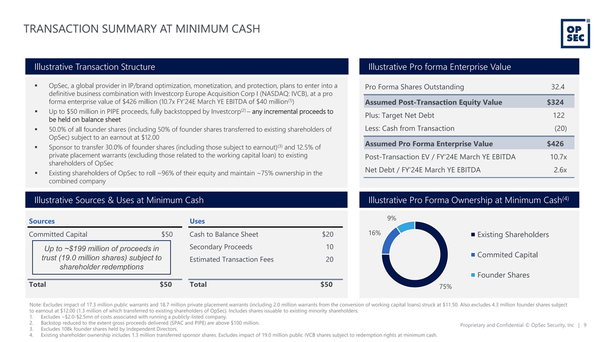 OVERVIEW OF TRANSACTION Investcorp Europe Acquisition Corp I (NASDAQ: IVCB) to merge with OpSec Group (1) Valuation Pro forma enterprise value of $426 million (10.7x FY’24E March YE EBITDA of $40 million ) (2) $50 million PIPE fully backstopped by Investcorp Capital Sources Up to $199 million of proceeds held in trust subject to shareholder redemptions (1) Pro forma net debt of $102 million (2.6x FY’24E March YE EBITDA of $40 million ) with Capital Structure $50 million of gross proceeds; incremental proceeds from SPAC and PIPE to deliver additional cash to balance sheet 1. Excludes ~$2.0-$2.5mn of costs associated with running a publicly-listed company. Proprietary and Confidential © OpSec Security, Inc | 8 2. Backstop reduced to the extent gross proceeds delivered (SPAC and PIPE) are above $100 million.