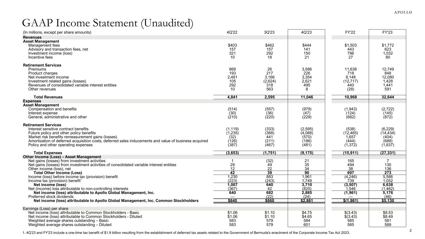 (In millions, except per share amounts) 4Q'22 3Q'23 4Q'23 FY'22 FY'23 Revenues     Asset Management     Management fees $403 $462 $444 $1,503 $1,772 Advisory and transaction fees, net 157 157 141 443 623 Investment income (loss) 321 292 150 796 1,032 Incentive fees 10 18 21 27 80   Retirement Services     Premiums 869 26 3,586 11,638 12,749 Product charges 193 217 226 718 848 Net investment income 2,481 3,166 3,354 8,148 12,080 Investment related gains (losses) 105 (2,624) 2,621 (12,717) 1,428 Revenues of consolidated variable interest entities 292 318 495 440 1,441 Other revenues 10 563 8 (28) 591   Total Revenues 4,841 2,595 11,046 10,968 32,644 Expenses Asset Management     Compensation and benefits (514) (557) (979) (1,943) (2,722) Interest expense (30) (36) (47) (124) (145) General, administrative and other (210) (220) (229) (682) (872)   Retirement Services     Interest sensitive contract benefits (1,119) (333) (2,595) (538) (6,229) Future policy and other policy benefits (1,235) (368) (4,088) (12,465) (14,434) Market risk benefits remeasurement gains (losses) (32) 441 (570) 1,657 (404) Amortization of deferred acquisition costs, deferred sales inducements and value of business acquired (126) (211) (186) (444) (688) Policy and other operating expenses (387) (467) (481) (1,372) (1,837)   Total Expenses (3,653) (1,751) (9,175) (15,911) (27,331) Other Income (Loss) – Asset Management Net gains (losses) from investment activities 1 (32) 21 165 7 Net gains (losses) from investment activities of consolidated variable interest entities 29 49 35 494 130 Other income (loss), net 12 22 34 38 136 Total Other Income (Loss) 42 39 90 697 273 Income (loss) before income tax (provision) benefit 1,230 883 1,961 (4,246) 5,586 Income tax (provision) benefit1 (223) (243) 1,749 739 1,052 Net income (loss) 1,007 640 3,710 (3,507) 6,638 Net (income) loss attributable to non-controlling interests (367) 42 (825) 1,546 (1,462) Net income (loss) attributable to Apollo Global Management, Inc. 640 682 2,885 (1,961) 5,176 Preferred stock dividends — (22) (24) — (46) Net income (loss) attributable to Apollo Global Management, Inc. Common Stockholders $640 $660 $2,861 $(1,961) $5,130       Earnings (Loss) per share Net income (loss) attributable to Common Stockholders - Basic $1.06 $1.10 $4.75 $(3.43) $8.53 Net income (loss) attributable to Common Stockholders - Diluted $1.06 $1.10 $4.65 $(3.43) $8.49 Weighted average shares outstanding – Basic 583 579 584 585 581 Weighted average shares outstanding – Diluted 583 579 601 585 589 GAAP Income Statement (Unaudited) 2 1. 4Q'23 and FY'23 include a one-time tax benefit of $1.9 billion resulting from the establishment of deferred tax assets related to the Government of Bermuda's enactment of the Corporate Income Tax Act 2023.