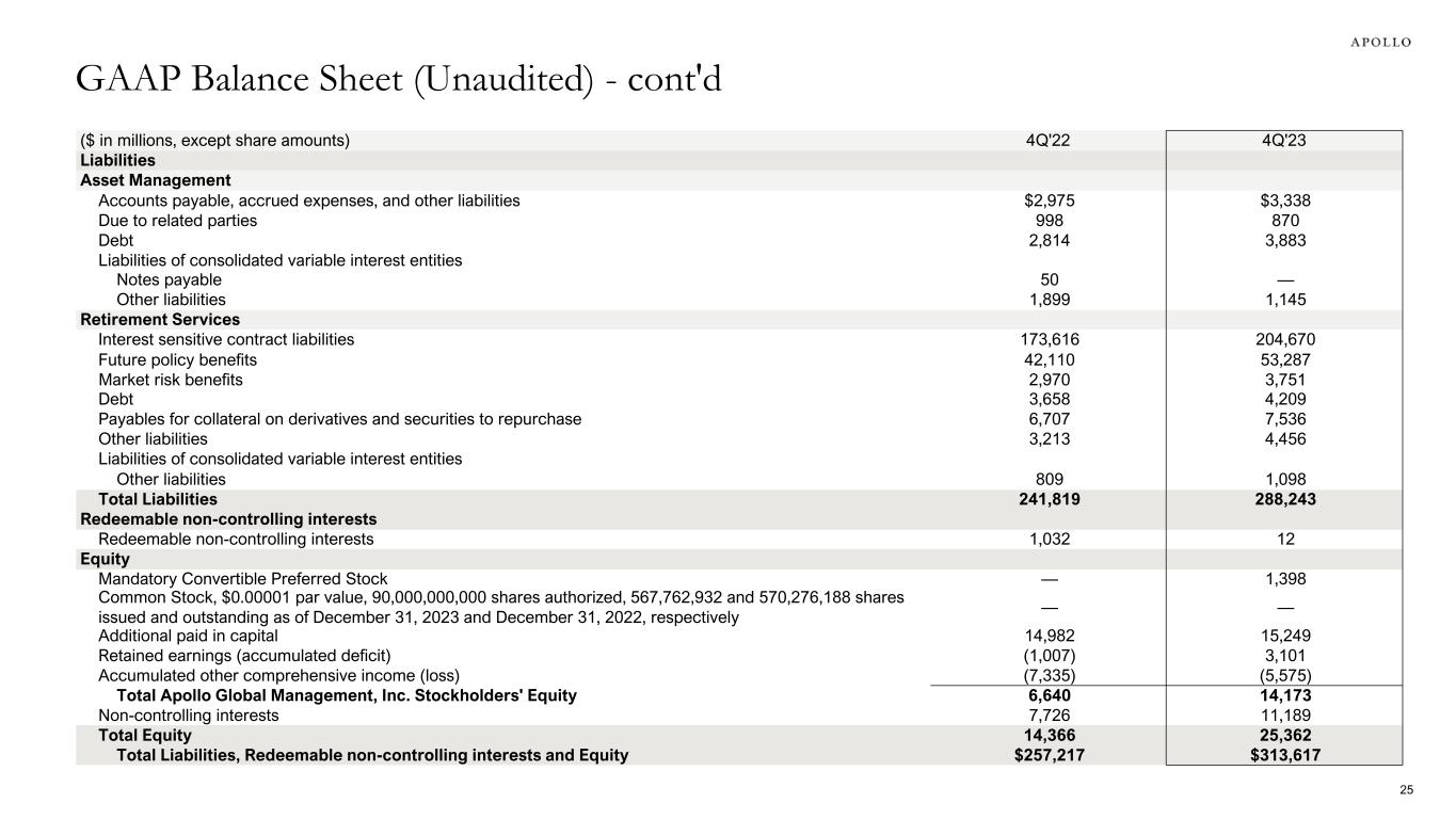 ($ in millions, except share amounts) 4Q'22 4Q'23 Liabilities Asset Management Accounts payable, accrued expenses, and other liabilities $2,975 $3,338 Due to related parties 998 870 Debt 2,814 3,883 Liabilities of consolidated variable interest entities Notes payable 50 — Other liabilities 1,899 1,145 Retirement Services Interest sensitive contract liabilities 173,616 204,670 Future policy benefits 42,110 53,287 Market risk benefits 2,970 3,751 Debt 3,658 4,209 Payables for collateral on derivatives and securities to repurchase 6,707 7,536 Other liabilities 3,213 4,456 Liabilities of consolidated variable interest entities Other liabilities 809 1,098 Total Liabilities 241,819 288,243 Redeemable non-controlling interests Redeemable non-controlling interests 1,032 12 Equity Mandatory Convertible Preferred Stock — 1,398 Common Stock, $0.00001 par value, 90,000,000,000 shares authorized, 567,762,932 and 570,276,188 shares issued and outstanding as of December 31, 2023 and December 31, 2022, respectively — — Additional paid in capital 14,982 15,249 Retained earnings (accumulated deficit) (1,007) 3,101 Accumulated other comprehensive income (loss) (7,335) (5,575) Total Apollo Global Management, Inc. Stockholders' Equity 6,640 14,173 Non-controlling interests 7,726 11,189 Total Equity 14,366 25,362 Total Liabilities, Redeemable non-controlling interests and Equity $257,217 $313,617 GAAP Balance Sheet (Unaudited) - cont'd 25