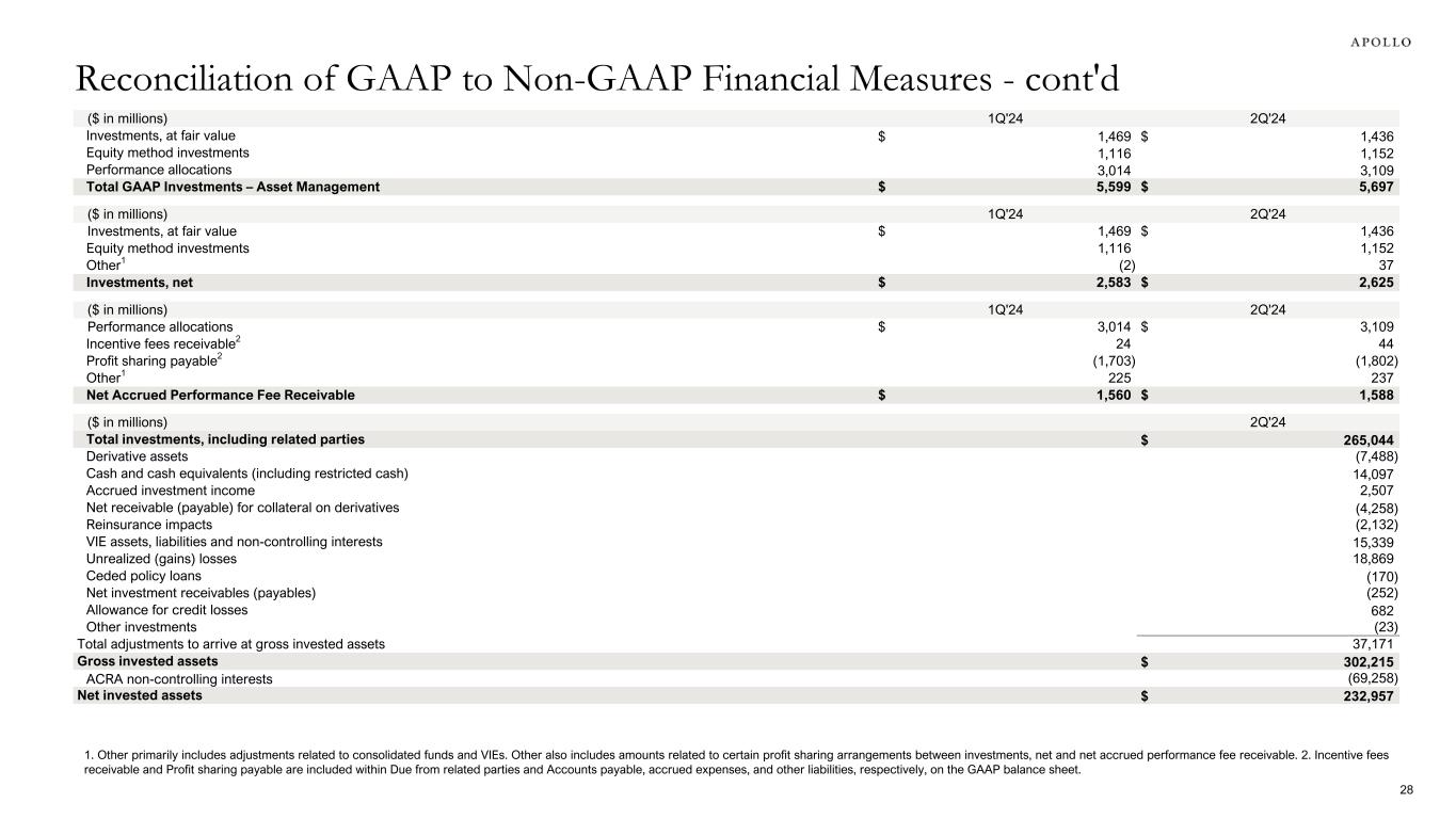 (In millions, except per share amounts) 2Q'23 1Q'24 2Q'24 YTD'23 YTD'24 Revenues     Asset Management     Management fees $452 $438 $462 $866 $900 Advisory and transaction fees, net 170 169 267 325 436 Investment income (loss) 138 402 278 590 680 Incentive fees 26 26 47 41 73   Retirement Services     Premiums 9,041 101 673 9,137 774 Product charges 207 238 251 405 489 Net investment income 2,948 3,576 3,804 5,560 7,380 Investment related gains (losses) 366 1,677 (134) 1,431 1,543 Revenues of consolidated variable interest entities 347 411 366 628 777 Other revenues 7 2 4 20 6   Total Revenues 13,702 7,040 6,018 19,003 13,058 Expenses Asset Management     Compensation and benefits (516) (667) (604) (1,186) (1,271) Interest expense (31) (51) (53) (62) (104) General, administrative and other (226) (240) (319) (423) (559)   Retirement Services     Interest sensitive contract benefits (2,012) (2,884) (1,824) (3,301) (4,708) Future policy and other policy benefits (9,512) (543) (1,095) (9,978) (1,638) Market risk benefits remeasurement gains (losses) 71 154 16 (275) 170 Amortization of deferred acquisition costs, deferred sales inducements and value of business acquired (153) (207) (227) (291) (434) Policy and other operating expenses (452) (453) (478) (889) (931)   Total Expenses (12,831) (4,891) (4,584) (16,405) (9,475) Other Income (Loss) – Asset Management Net gains (losses) from investment activities 20 39 (21) 18 18 Net gains (losses) from investment activities of consolidated variable interest entities 12 25 1 46 26 Other income (loss), net 48 (26) 24 80 (2) Total Other Income (Loss) 80 38 4 144 42 Income (loss) before income tax (provision) benefit 951 2,187 1,438 2,742 3,625 Income tax (provision) benefit (201) (422) (261) (454) (683) Net income (loss) 750 1,765 1,177 2,288 2,942 Net (income) loss attributable to non-controlling interests (151) (338) (324) (679) (662) Net income (loss) attributable to Apollo Global Management, Inc. 599 1,427 853 1,609 2,280 Preferred stock dividends — (24) (25) — (49) Net income (loss) attributable to Apollo Global Management, Inc. Common Stockholders $599 $1,403 $828 $1,609 $2,231       Earnings (Loss) per share Net income (loss) attributable to Common Stockholders - Basic $1.00 $2.31 $1.36 $2.67 $3.67 Net income (loss) attributable to Common Stockholders - Diluted $1.00 $2.28 $1.35 $2.67 $3.64 Weighted average shares outstanding – Basic 579 588 587 582 588 Weighted average shares outstanding – Diluted 579 605 590 582 605 GAAP Income Statement (Unaudited) 2