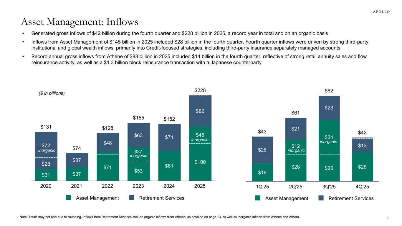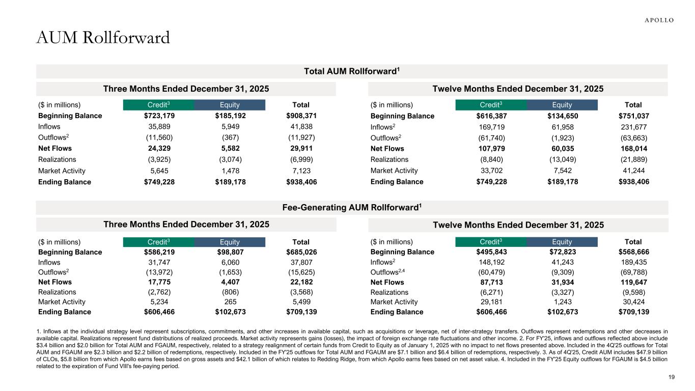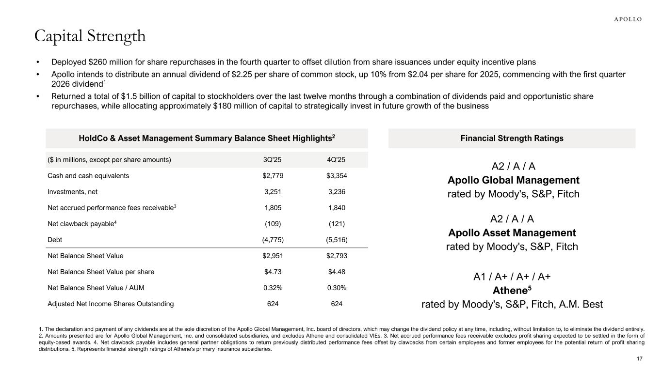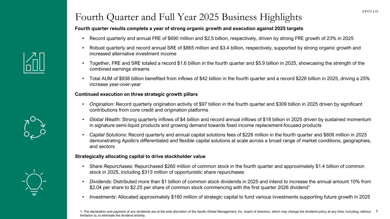 Fourth quarter results complete a year of strong organic growth and execution against 2025 targets • Record quarterly and annual FRE of $690 million and $2.5 billion, respectively, driven by strong FRE growth of 23% in 2025 • Robust quarterly and record annual SRE of $865 million and $3.4 billion, respectively, supported by strong organic growth and increased alternative investment income • Together, FRE and SRE totaled a record $1.6 billion in the fourth quarter and $5.9 billion in 2025, showcasing the strength of the combined earnings streams • Total AUM of $938 billion benefited from inflows of $42 billion in the fourth quarter and a record $228 billion in 2025, driving a 25% increase year-over-year Continued execution on three strategic growth pillars • Origination: Record quarterly origination activity of $97 billion in the fourth quarter and $309 billion in 2025 driven by significant contributions from core credit and origination platforms • Global Wealth: Strong quarterly inflows of $4 billion and record annual inflows of $18 billion in 2025 driven by sustained momentum in signature semi-liquid products and growing demand towards fixed income replacement-focused products • Capital Solutions: Record quarterly and annual capital solutions fees of $226 million in the fourth quarter and $808 million in 2025 demonstrating Apollo's differentiated and flexible capital solutions at scale across a broad range of market conditions, geographies, and sectors Strategically allocating capital to drive stockholder value • Share Repurchases: Repurchased $260 million of common stock in the fourth quarter and approximately $1.4 billion of common stock in 2025, including $313 million of opportunistic share repurchases • Dividends: Distributed more than $1 billion of common stock dividends in 2025 and intend to increase the annual amount 10% from $2.04 per share to $2.25 per share of common stock commencing with the first quarter 2026 dividend1 • Investments: Allocated approximately $180 million of strategic capital to fund various investments supporting future growth in 2025 Fourth Quarter and Full Year 2025 Business Highlights ✓ ✓ 31. The declaration and payment of any dividends are at the sole discretion of the Apollo Global Management, Inc. board of directors, which may change the dividend policy at any time, including, without limitation to, to eliminate the dividend entirely.