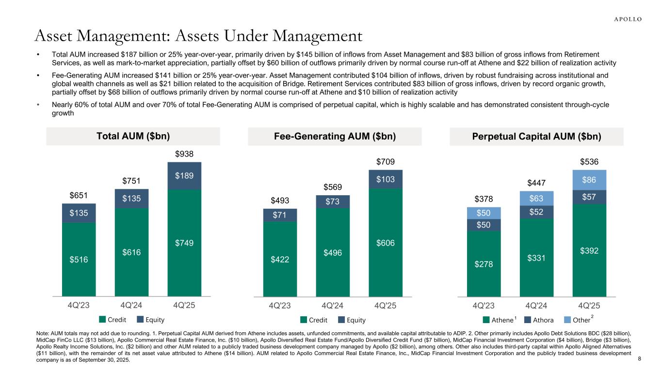 • Management fees increased 22% in 2025 driven by increasing contribution of third-party asset management inflows into Equity strategies, solid levels of capital deployment, as well as strong growth from Retirement Services clients • Capital solutions fees grew 21% in 2025 primarily driven by continued strength and growing diversification across Apollo's origination ecosystem including direct origination, asset-backed finance, multi-credit and opportunistic credit transactions • Fee-related performance fees increased 28% in 2025 primarily driven by sustained growth across diversified global wealth products and perpetual capital vehicles • FRE grew 23% in 2025, net of the continued investment in hiring and infrastructure to support the firm's global strategic growth initiatives, as well as the full- quarter run-rate from the Bridge1 acquisition and year-end expense seasonality in the fourth quarter ($ in millions, except per share amounts) 4Q'24 3Q'25 4Q'25 % Change vs. 4Q'24 FY'24 FY'25 % Change vs. FY'24 Management Fees Credit $550 $632 $669 21.6% $2,015 $2,475 22.8% Equity 192 231 273 42.2% 761 916 20.4% Total management fees 742 863 942 27.0% 2,776 3,391 22.2% Capital solutions fees and other, net 160 212 226 41.3% 668 808 21.0% Fee-related performance fees 53 73 76 43.4% 208 266 27.9% Fee Related Revenues $955 $1,148 $1,244 30.3% $3,652 $4,465 22.3% Fee-related compensation (227) (304) (336) 48.0% (925) (1,178) 27.4% Non-compensation expenses2 (174) (192) (218) 25.3% (664) (759) 14.3% Fee Related Earnings $554 $652 $690 24.5% $2,063 $2,528 22.5% FRE per share $0.90 $1.04 $1.11 23.3% $3.36 $4.08 21.4% FRE Margin 58.0% 56.8% 55.5% 56.5% 56.6% FRE Compensation Ratio 23.8% 26.5% 27.0% 25.3% 26.4% Asset Management Segment 1. In 3Q'25, Apollo completed the previously announced acquisition of Bridge Investment Group Holdings Inc. (together with its subsidiaries, "Bridge"). 2. Non-compensation expenses include placement fees of $9  million and $46  million, respectively, for 4Q'25 and FY'25. FY'24 non-compensation expenses include $15 million of costs related to the merger of two closed-end funds with MidCap Financial Investment Corporation, a publicly traded business development company managed by Apollo. 7