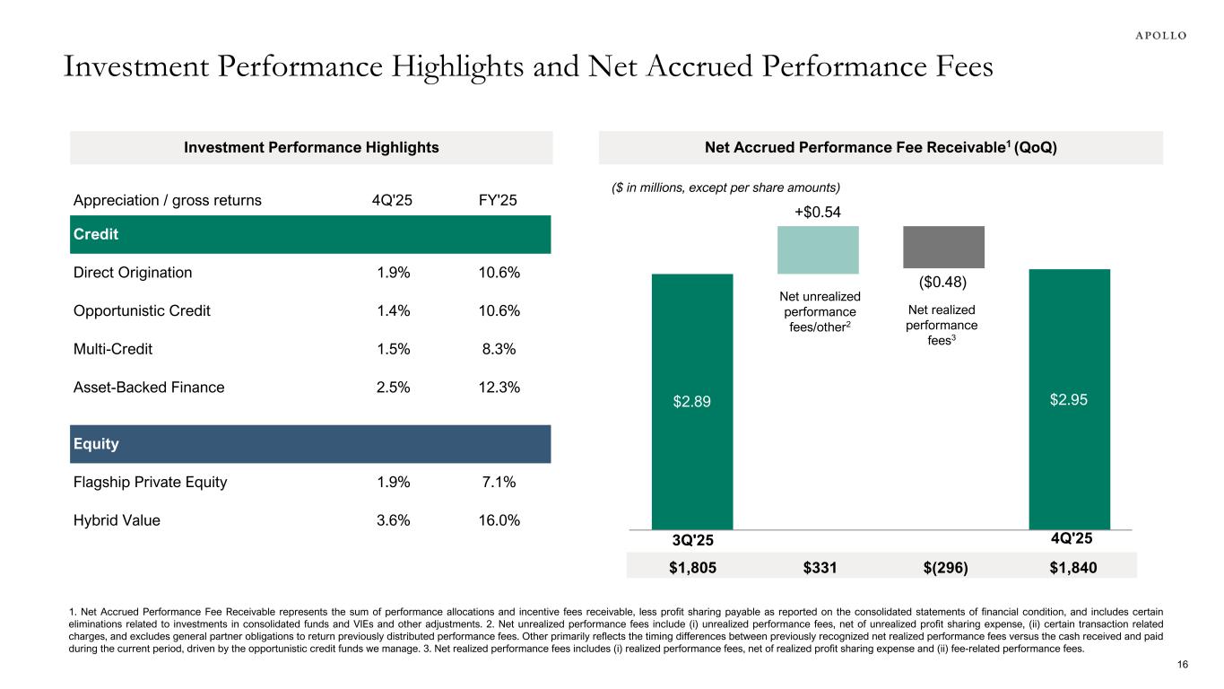 Share Reconciliation 4Q'24 1Q'25 2Q'25 3Q'25 4Q'25 Total GAAP Common Stock Outstanding 565,738,933 570,432,275 572,024,038 580,389,090 578,981,398 Non-GAAP Adjustments: Mandatory Convertible Preferred Stock1 14,536,019 14,538,803 14,547,261 14,555,555 14,564,883 Vested RSUs 21,337,132 16,145,959 16,162,939 16,388,324 19,437,942 Unvested RSUs Eligible for Dividend Equivalents 11,455,245 12,646,550 12,749,090 12,931,604 10,518,154 Adjusted Net Income Shares Outstanding 613,067,329 613,763,587 615,483,328 624,264,573 623,502,377 1. Reflects the number of shares of underlying common stock assumed to be issuable upon conversion of the Mandatory Convertible Preferred Stock during each period. 2. Reflects shares issued to the Apollo donor-advised fund in February 2025, shares issued in April 2025 in relation to a cashless exercise of 2.6 million vested warrants issued in 2022 and shares issued in September 2025 in connection with the closing of the acquisition of Bridge. 3. Average cost reflects total capital used for share repurchases in a given period divided by the number of shares purchased. 4. Effective on February 9, 2026, the Apollo Global Management, Inc. board of directors terminated the Company's prior share repurchase program and approved a new share repurchase program, pursuant to which the Company is authorized to repurchase up to $4.0 billion of shares of its common stock. The share repurchase program may be used to repurchase outstanding shares of common stock as well as to reduce shares that otherwise would have been issued to participants under the Company’s equity incentive plans in order to satisfy associated tax obligations. The Company's prior repurchase program, approved by the Apollo Global Management, Inc. board of directors on February 8, 2024, authorized the Company to repurchase up to $3.0 billion of shares of its common stock, to repurchase outstanding shares of common stock and reduce shares that otherwise would have been issued to participants under the Company's equity incentive plans in order to satisfy associated tax obligations. Share Activity 4Q'24 1Q'25 2Q'25 3Q'25 4Q'25 Shares Issued to Employees 263,340 4,293,251 86,143 294,245 210,568 Other Shares Issued2 — 1,213,003 1,080,041 10,342,223 — Shares Repurchased # of Shares 750,336 4,578,770 112,211 2,570,188 2,011,126 Average Cost3 $173.35 $157.58 $139.74 $138.69 $129.46 Capital Utilized $130.1 million $721.5 million $15.7 million $356.5 million $260.4 million Share Repurchase Plan Authorization Remaining4 $1.77 billion $1.05 billion $1.03 billion $0.68 billion $0.42 billion Sharecount Reconciliation 21