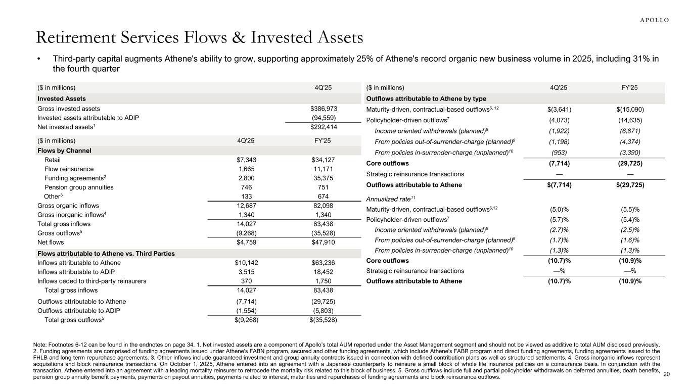20 Note: Footnotes 6-12 can be found in the endnotes on page 34. 1. Net invested assets are a component of Apollo’s total AUM reported under the Asset Management segment and should not be viewed as additive to total AUM disclosed previously. 2. Funding agreements are comprised of funding agreements issued under Athene's FABN program, secured and other funding agreements, which include Athene's FABR program and direct funding agreements, funding agreements issued to the FHLB and long term repurchase agreements. 3. Other inflows include guaranteed investment and group annuity contracts issued in connection with defined contribution plans as well as structured settlements. 4. Gross inorganic inflows represent acquisitions and block reinsurance transactions. On October 1, 2025, Athene entered into an agreement with a Japanese counterparty to reinsure a small block of whole life insurance policies on a coinsurance basis. In conjunction with the transaction, Athene entered into an agreement with a leading mortality reinsurer to retrocede the mortality risk related to this block of business. 5. Gross outflows include full and partial policyholder withdrawals on deferred annuities, death benefits, pension group annuity benefit payments, payments on payout annuities, payments related to interest, maturities and repurchases of funding agreements and block reinsurance outflows. Retirement Services Flows & Invested Assets • Third-party capital augments Athene's ability to grow, supporting approximately 25% of Athene's record organic new business volume in 2025, including 31% in the fourth quarter ($ in millions) 4Q'25 FY'25 Flows by Channel Retail $7,343 $34,127 Flow reinsurance 1,665 11,171 Funding agreements2 2,800 35,375 Pension group annuities 746 751 Other3 133 674 Gross organic inflows 12,687 82,098 Gross inorganic inflows4 1,340 1,340 Total gross inflows 14,027 83,438 Gross outflows5 (9,268) (35,528) Net flows $4,759 $47,910 Flows attributable to Athene vs. Third Parties Inflows attributable to Athene $10,142 $63,236 Inflows attributable to ADIP 3,515 18,452 Inflows ceded to third-party reinsurers 370 1,750 Total gross inflows 14,027 83,438 Outflows attributable to Athene (7,714) (29,725) Outflows attributable to ADIP (1,554) (5,803) Total gross outflows5 $(9,268) $(35,528) ($ in millions) 4Q'25 Invested Assets Gross invested assets $386,973 Invested assets attributable to ADIP (94,559) Net invested assets1 $292,414 ($ in millions) 4Q'25 FY'25 Outflows attributable to Athene by type Maturity-driven, contractual-based outflows6, 12 $(3,641) $(15,090) Policyholder-driven outflows7 (4,073) (14,635) Income oriented withdrawals (planned)8 (1,922) (6,871) From policies out-of-surrender-charge (planned)9 (1,198) (4,374) From policies in-surrender-charge (unplanned)10 (953) (3,390) Core outflows (7,714) (29,725) Strategic reinsurance transactions — — Outflows attributable to Athene $(7,714) $(29,725) Annualized rate11 Maturity-driven, contractual-based outflows6,12 (5.0)% (5.5)% Policyholder-driven outflows7 (5.7)% (5.4)% Income oriented withdrawals (planned)8 (2.7)% (2.5)% From policies out-of-surrender-charge (planned)9 (1.7)% (1.6)% From policies in-surrender-charge (unplanned)10 (1.3)% (1.3)% Core outflows (10.7)% (10.9)% Strategic reinsurance transactions —% —% Outflows attributable to Athene (10.7)% (10.9)%