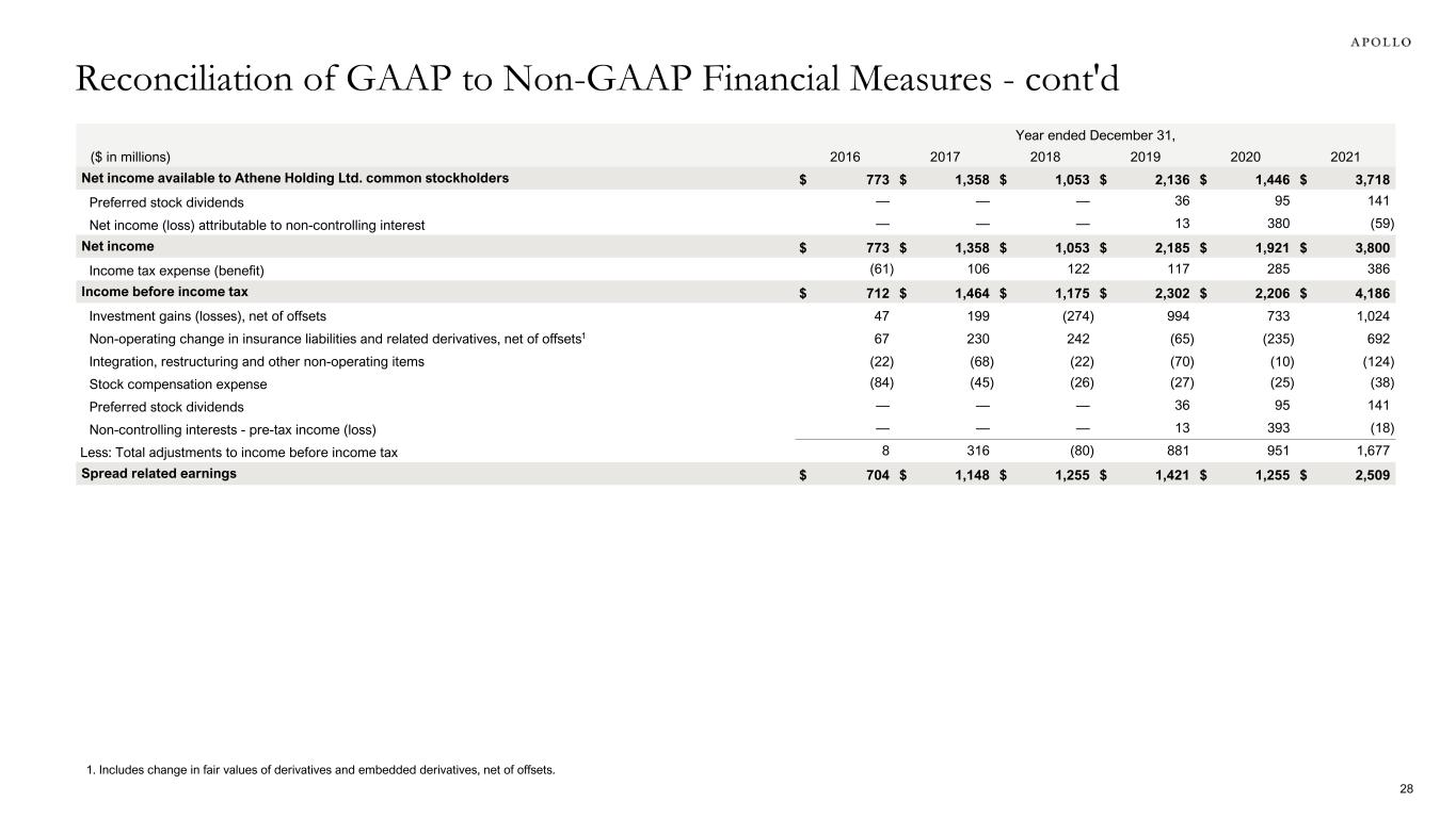 • “Segment Income”, or “SI”, is the key performance measure used by management in evaluating the performance of the asset management, retirement services, and principal investing segments. Management uses Segment Income to make key operating decisions such as the following: ▪ decisions related to the allocation of resources such as staffing decisions including hiring and locations for deployment of the new hires; ▪ decisions related to capital deployment such as providing capital to facilitate growth for the business and/or to facilitate expansion into new businesses; ▪ decisions related to expenses, such as determining annual discretionary bonuses and equity-based compensation awards to its employees. With respect to compensation, management seeks to align the interests of certain professionals and selected other individuals with those of the investors in the funds and those of Apollo’s stockholders by providing such individuals a profit sharing interest in the performance fees earned in relation to the funds. To achieve that objective, a certain amount of compensation is based on Apollo’s performance and growth for the year; and ▪ decisions related to the amount of earnings available for dividends to Common Stockholders and holders of RSUs that participate in dividends. Segment Income is the sum of (i) Fee Related Earnings, (ii) Spread Related Earnings, and (iii) Principal Investing Income. Segment Income excludes the effects of the consolidation of any of the related funds, HoldCo interest and other financing costs not attributable to any specific segment, Taxes and Related Payables, transaction-related charges and other non-operating expenses. Transaction-related charges includes equity-based compensation charges, the amortization of intangible assets, contingent consideration, and certain other charges associated with acquisitions, and restructuring charges. Non-operating expenses includes certain charitable contributions and other non- operating expenses. In addition, Segment Income excludes non-cash revenue and expense related to equity awards granted by unconsolidated related parties to employees of the Company, compensation and administrative related expense reimbursements, as well as the assets, liabilities and operating results of the funds and VIEs that are included in the consolidated financial statements. • “Fee Related Earnings”, or “FRE”, is a component of Segment Income that is used to assess the performance of the Asset Management segment. FRE is the sum of (i) management fees, (ii) capital solutions and other related fees, (iii) fee-related performance fees from indefinite term vehicles, that are measured and received on a recurring basis and not dependent on realization events of the underlying investments, excluding performance fees from Athene and performance fees from origination platforms dependent on capital appreciation, and (iv) other income, net, less (a) fee-related compensation, excluding equity-based compensation, (b) non-compensation expenses incurred in the normal course of business, (c) placement fees and (d) non-controlling interests in the management companies of certain funds the Company manages. • “Spread Related Earnings”, or “SRE” is a component of Segment Income that is used to assess the performance of the Retirement Services segment, excluding certain market volatility, which consists of investment gains (losses), net of offsets and non-operating change in insurance liabilities and related derivatives, and certain expenses related to integration, restructuring, and equity-based compensation, as well as other items. For the Retirement Services segment, SRE equals the sum of (i) the net investment earnings on Athene’s net invested assets and (ii) management fees received on business managed for others, less (x) cost of funds, (y) operating expenses excluding equity- based compensation and (z) financing costs, including interest expense and preferred dividends, if any, paid to Athene preferred stockholders. • “Principal Investing Income”, or “PII” is a component of Segment Income that is used to assess the performance of the Principal Investing segment. For the Principal Investing segment, PII is the sum of (i) realized performance fees, including certain realizations received in the form of equity, (ii) realized investment income, less (x) realized principal investing compensation expense, excluding expense related to equity-based compensation, and (y) certain corporate compensation and non-compensation expenses. • “Adjusted Net Income” or “ANI” represents Segment Income less HoldCo interest and other financing costs and estimated income taxes. Adjusted Net Income is calculated and presented on the basis of methodologies other than in accordance with generally accepted accounting principles in the United States of America (“non-GAAP”). Income taxes on FRE and PII represents the total current corporate, local, and non-U.S. taxes as well as the current payable under Apollo’s tax receivable agreement. Income taxes on FRE and PII excludes the impacts of deferred taxes and the remeasurement of the tax receivable agreement, which arise from changes in estimated future tax rates. For purposes of calculating the Adjusted Net Income tax rate, Segment Income is reduced by HoldCo interest and financing costs. Certain assumptions and methodologies that impact the implied FRE and PII income tax provision are similar to those used under U.S. GAAP. Specifically, certain deductions considered in the income tax provision under U.S. GAAP relating to transaction-related costs, equity-based compensation, charitable contributions and tax deductible interest expense are taken into account for the implied tax provision. Income Taxes on SRE represent the total current and deferred tax expense or benefit on income before taxes adjusted to eliminate the impact of the tax expense or benefit associated wit