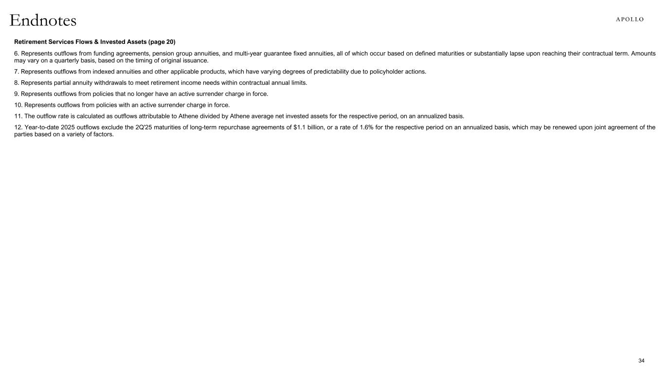 • “Net IRR” of a traditional private equity or hybrid value fund represents the gross IRR applicable to a fund, including returns for related parties which may not pay fees or performance fees, net of management fees, certain expenses (including interest incurred or earned by the fund itself) and realized performance fees all offset to the extent of interest income, and measures returns at the fund level on amounts that, if distributed, would be paid to investors of the fund. The timing of cash flows applicable to investments, management fees and certain expenses, may be adjusted for the usage of a fund’s subscription facility. To the extent that a fund exceeds all requirements detailed within the applicable fund agreement, the estimated unrealized value is adjusted such that a percentage of up to 20.0% of the unrealized gain is allocated to the general partner of such fund, thereby reducing the balance attributable to fund investors. In addition, net IRR at the fund level will differ from that at the individual investor level as a result of, among other factors, timing of investor-level inflows and outflows. Net IRR does not represent the return to any fund investor. • “Net IRR” of infrastructure funds represents the cumulative cash flows in a fund (and not any one investor in the fund), on the basis of the actual timing of cash inflows received from and outflows paid to investors of the fund (assuming the ending net asset value as of December 31, 2025 or other date specified is paid to investors), excluding certain non-fee and non-performance fee bearing parties, and the return is annualized and compounded after management fees, performance fees, and certain other expenses (including interest incurred by the fund itself) and measures the returns to investors of the fund as a whole. Non-USD fund cash flows and residual values are converted to USD using the spot rate as of the reporting date. In addition, net IRR at the fund level will differ from that at the individual investor level as a result of, among other factors, timing of investor-level inflows and outflows. Net IRR does not represent the return to any fund investor. • “Origination” represents (i) capital that has been invested in new equity, debt or debt-like investments by Apollo's equity and credit strategies (whether purchased by funds and accounts managed by Apollo, or syndicated to third parties) where Apollo or one of Apollo's origination platforms has sourced, negotiated, or significantly affected the commercial terms of the investment; (ii) new capital pools formed by debt issuances, including CLOs; and (iii) net purchases of certain assets by the funds and accounts we manage that we consider to be private, illiquid, and hard to access assets and which the funds and accounts otherwise may not be able to meaningfully access. Origination generally excludes any issuance of debt or debt-like investments by the portfolio companies of the funds we manage. • “Other operating expenses” within the Principal Investing segment represents expenses incurred in the normal course of business and includes allocations of non-compensation expenses related to managing the business. • “Other operating expenses” within the Retirement Services segment represents expenses incurred in the normal course of business inclusive of compensation and non-compensation expenses, but does not include the proportionate share of the ACRA operating expenses associated with the non-controlling interests. • “Perpetual capital” refers to assets under management of certain vehicles with an indefinite duration, which assets may only be withdrawn under certain conditions or subject to certain limitations, including satisfying required hold periods or percentage limits on the amounts that may be redeemed over a particular period. The investment management, advisory or other service agreements with our perpetual capital vehicles may be terminated under certain circumstances. • “PII Compensation Ratio” is calculated as Principal investing compensation divided by the sum of realized performance fees and realized investment income. • “Principal investing compensation” within the Principal Investing segment represents realized performance compensation, distributions related to investment income and dividends, and includes allocations of certain compensation expenses related to managing the business. • “Realized Value” refers to all cash investment proceeds received by the relevant Apollo fund, including interest and dividends, but does not give effect to management fees, expenses, incentive compensation or performance fees to be paid by such Apollo fund. • “Redding Ridge” refers to Redding Ridge Asset Management, LLC and its subsidiaries, which is a standalone, self-managed asset management business established in connection with risk retention rules that manages CLOs and retains the required risk retention interests. • “Remaining Cost” represents Total Invested Capital, reduced for any return of capital proceeds received to date. • “Total Invested Capital” refers to the aggregate cash invested by the relevant Apollo fund and includes capitalized costs relating to investment activities, if any, but does not give effect to cash pending investment or available for reserves and excludes amounts, if any, invested on a financed basis with leverage facilities. • “Total Value” represents the sum of the total Realized Value and Unrealized Value of investments. • “Unrealized Value” refers to the fair value consistent with valuations determined in accordance with GAAP, for investments not yet realized and may include payments in kind, accrued interest and dividends receivable, if any, and before the effect of certain taxes. In addition, amounts include committed and funded amounts for certain investments. • “Vintage Year” refers to the year in which a fund’s final capital raise occur