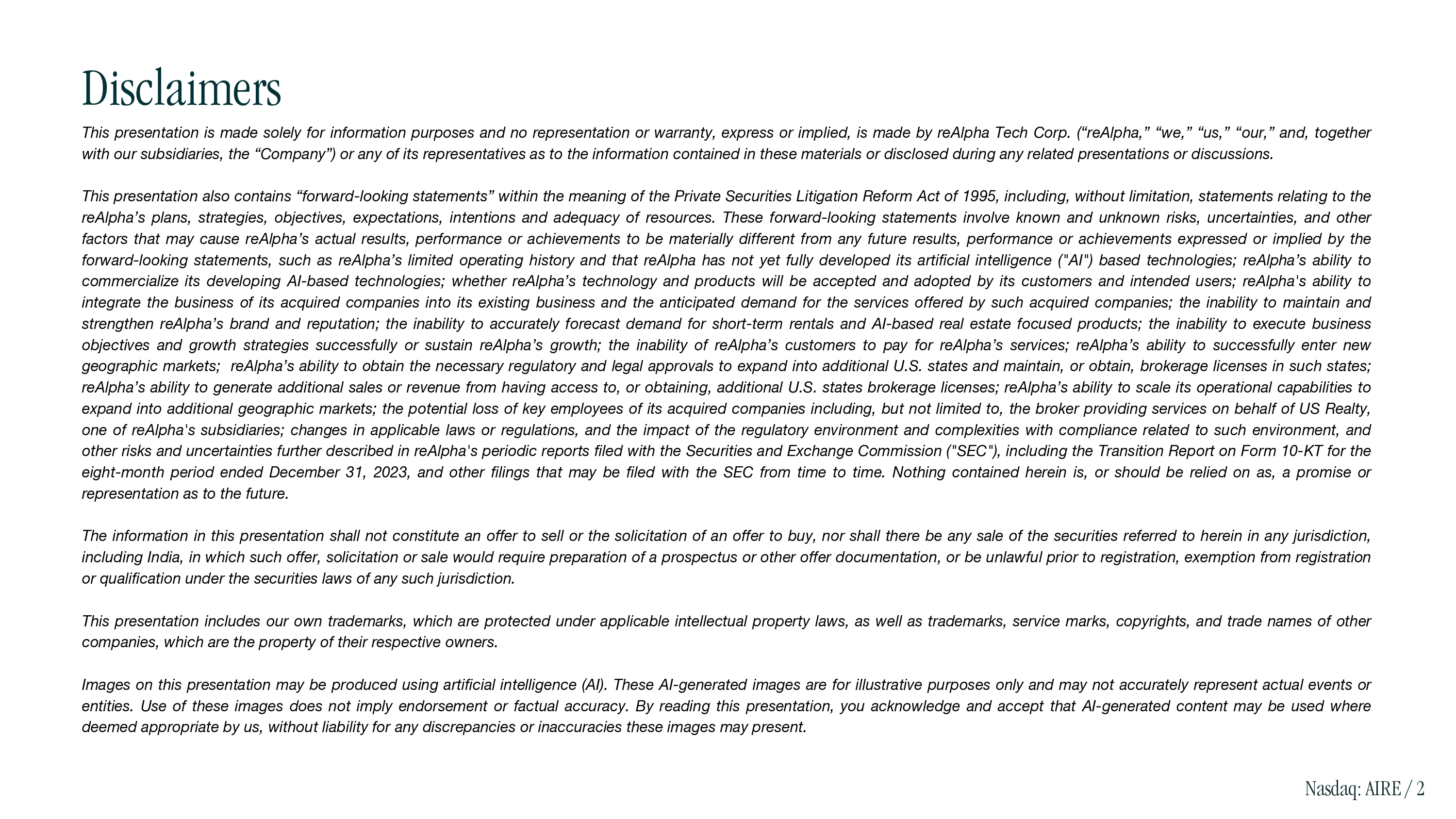 Disclaimers This presentation is made solely for information purposes and no representation or warranty, express or implied, is made by reAlpha Tech Corp. (“reAlpha,” “we,” “us,” “our,” and, together with our subsidiaries, the “Company”) or any of its representatives as to the information contained in these materials or disclosed during any related presentations or discussions. This presentation also contains “forward - looking statements” within the meaning of the Private Securities Litigation Reform Act of 1995 , including, without limitation, statements relating to the reAlpha’s plans, strategies, objectives, expectations, intentions and adequacy of resources . These forward - looking statements involve known and unknown risks, uncertainties, and other factors that may cause reAlpha’s actual results, performance or achievements to be materially different from any future results, performance or achievements expressed or implied by the forward - looking statements, such as reAlpha’s limited operating history and that reAlpha has not yet fully developed its artificial intelligence ("AI") based technologies ; reAlpha’s ability to commercialize its developing AI - based technologies ; whether reAlpha’s technology and products will be accepted and adopted by its customers and intended users ; reAlpha's ability to integrate the business of its acquired companies into its existing business and the anticipated demand for the services offered by such acquired companies ; the inability to maintain and strengthen reAlpha’s brand and reputation ; the inability to accurately forecast demand for short - term rentals and AI - based real estate focused products ; the inability to execute business objectives and growth strategies successfully or sustain reAlpha’s growth ; the inability of reAlpha’s customers to pay for reAlpha’s services ; reAlpha’s ability to successfully enter new geographic markets ; reAlpha’s ability to obtain the necessary regulatory and legal approvals to expand into additional U . S . states and maintain, or obtain, brokerage licenses in such states ; reAlpha’s ability to generate additional sales or revenue from having access to, or obtaining, additional U . S . states brokerage licenses ; reAlpha’s ability to scale its operational capabilities to expand into additional geographic markets ; the potential loss of key employees of its acquired companies including, but not limited to, the broker providing services on behalf of US Realty, one of reAlpha's subsidiaries ; changes in applicable laws or regulations, and the impact of the regulatory environment and complexities with compliance related to such environment, and other risks and uncertainties further described in reAlpha's periodic reports filed with the Securities and Exchange Commission ("SEC"), including the Transition Report on Form 10 - KT for the eight - month period ended December 31 , 2023 , and other filings that may be filed with the SEC from time to time . Nothing contained herein is, or should be relied on as, a promise or representation as to the future . The information in this presentation shall not constitute an offer to sell or the solicitation of an offer to buy, nor shall there be any sale of the securities referred to herein in any jurisdiction, including India, in which such offer, solicitation or sale would require preparation of a prospectus or other offer documentation, or be unlawful prior to registration, exemption from registration or qualification under the securities laws of any such jurisdiction . This presentation includes our own trademarks, which are protected under applicable intellectual property laws, as well as trademarks, service marks, copyrights, and trade names of other companies, which are the property of their respective owners . Images on this presentation may be produced using artificial intelligence (AI) . These AI - generated images are for illustrative purposes only and may not accurately represent actual events or entities . Use of these images does not imply endorsement or factual accuracy . By reading this presentation, you acknowledge and accept that AI - generated content may be used where deemed appropriate by us, without liability for any discrepancies or inaccuracies these images may present . Nasdaq: AIRE / 2