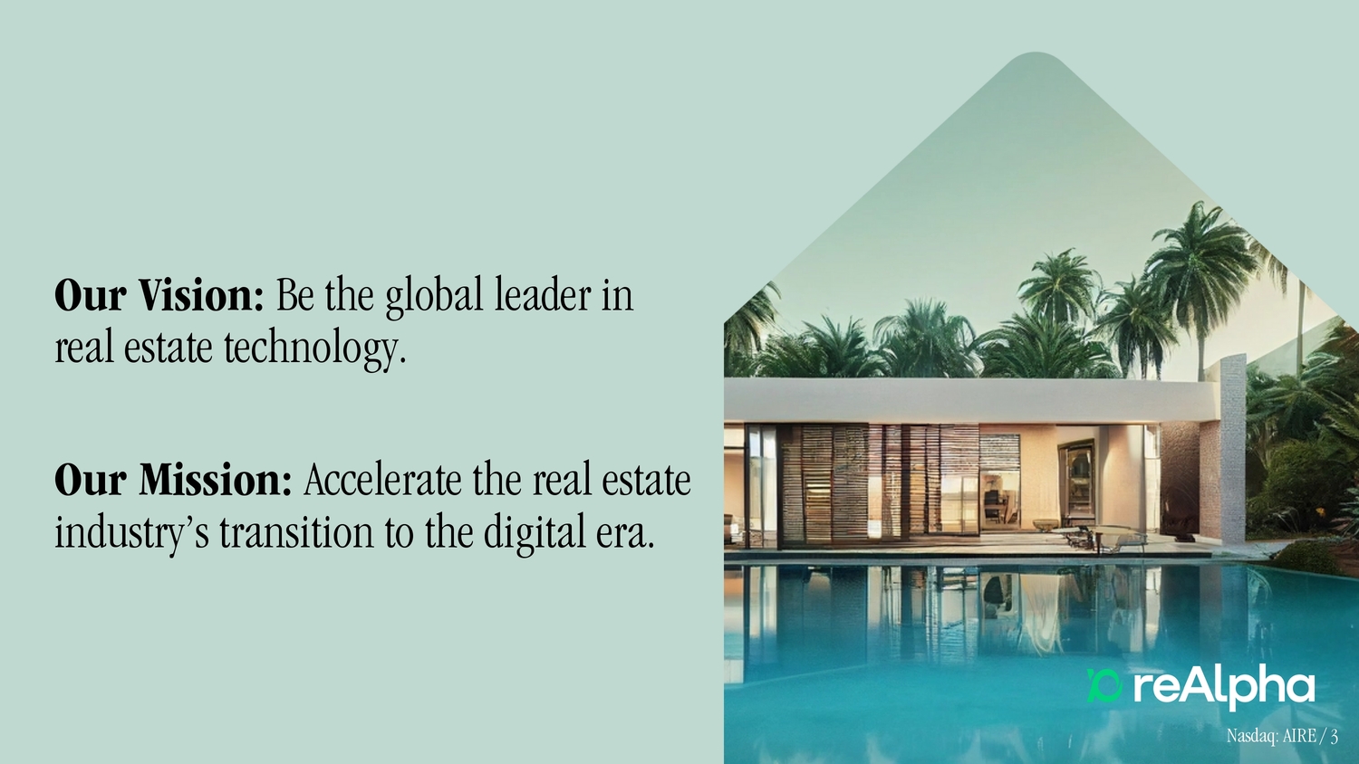 Our Vision: Be the global leader in real estate technology. Our Mission: Accelerate the real estate industry’s transition to the digital era. Nasdaq: AIRE / 3