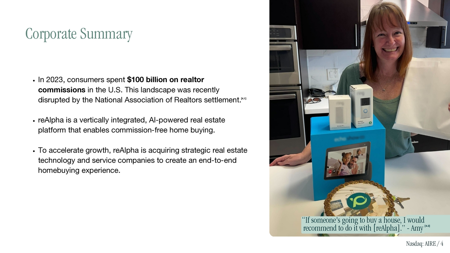 In 2023, consumers spent $100 billion on realtor commissions in the U.S. This landscape was recently disrupted by the National Association of Realtors settlement. [4.1] reAlpha is a vertically integrated, AI - powered real estate platform that enables commission - free home buying. To accelerate growth, reAlpha is acquiring strategic real estate technology and service companies to create an end - to - end homebuying experience. Corporate Summary “If someone's going to buy a house, I would recommend to do it with [reAlpha].” - Amy [4.2] Nasdaq: AIRE / 4