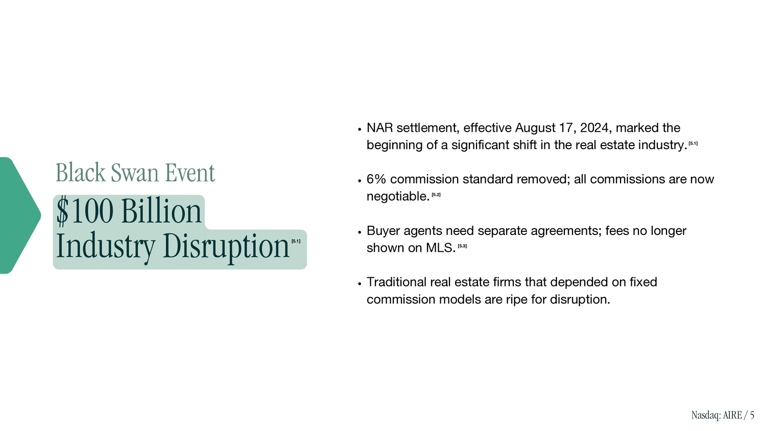 Black Swan Event $100 Billion Industry Disruptio n [5.1] Nasdaq: AIRE / 5 NAR settlement, effective August 17, 2024, marked the beginning of a significant shift in the real estate industry. [5.1] 6% commission standard removed; all commissions are now negotiable. [5.2] Buyer agents need separate agreements; fees no longer shown on MLS. [5.3] Traditional real estate firms that depended on fixed commission models are ripe for disruption.
