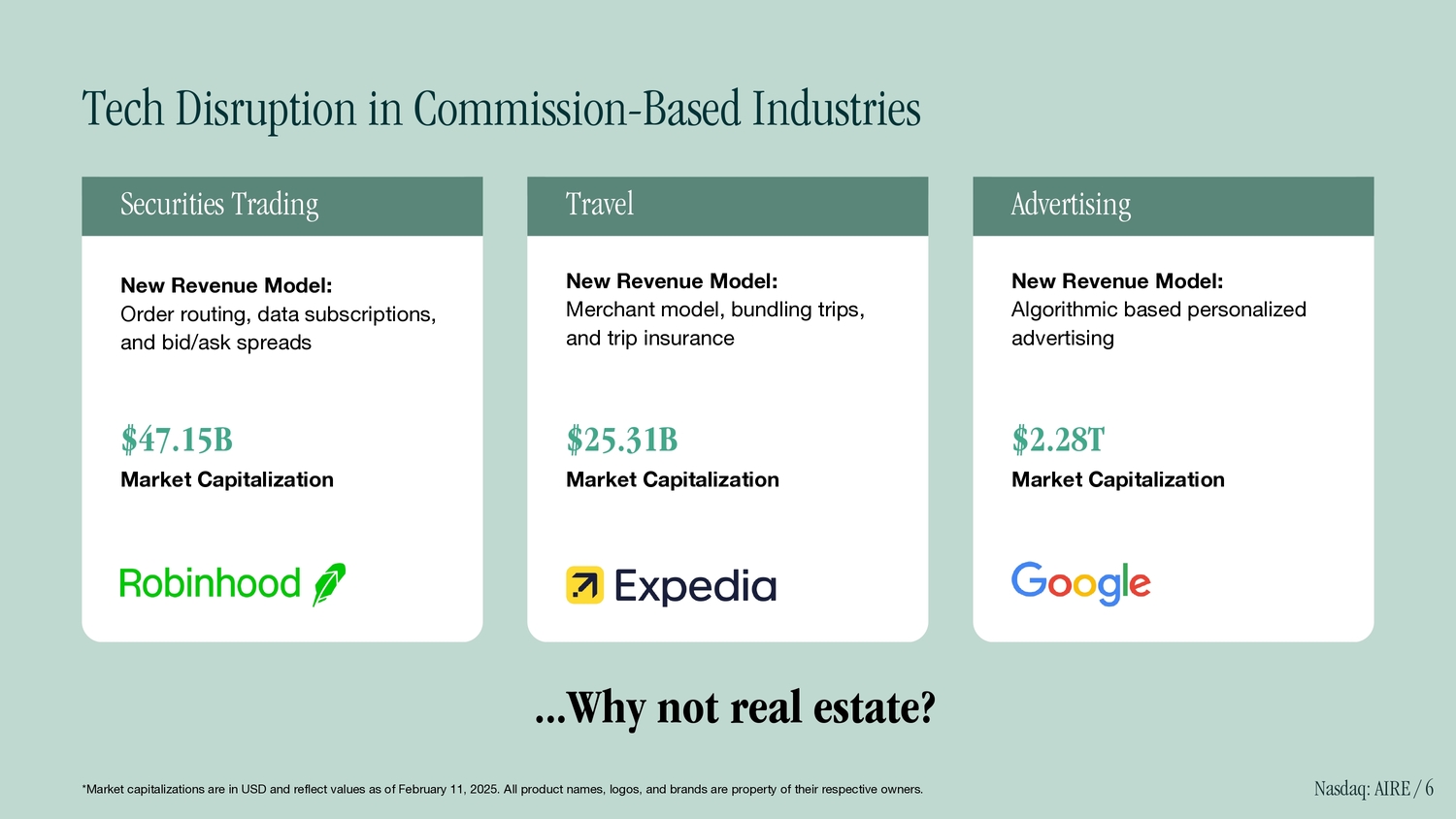 Tech Disruption in Commission - Based Industries New Revenue Model: Order routing, data subscriptions, and bid/ask spreads Securities Trading Travel Advertising New Revenue Model: Merchant model, bundling trips, and trip insurance New Revenue Model: Algorithmic based personalized advertising $47.15B Market Capitalization $25.31B Market Capitalization $2.28T Market Capitalization Nasdaq: AIRE / 6 ...Why not real estate? *Market capitalizations are in USD and reflect values as of February 11, 2025. All product names, logos, and brands are property of their respective owners.