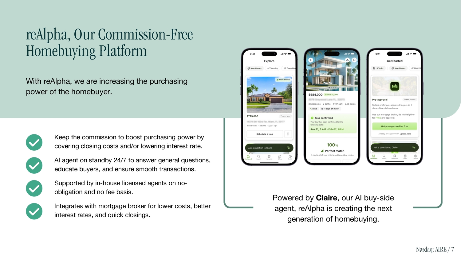 Keep the commission to boost purchasing power by covering closing costs and/or lowering interest rate. AI agent on standby 24/7 to answer general questions, educate buyers, and ensure smooth transactions. Supported by in - house licensed agents on no - obligation and no fee basis. Integrates with mortgage broker for lower costs, better interest rates, and quick closings. reAlpha, Our Commission - Free Homebuying Platform With reAlpha, we are increasing the purchasing power of the homebuyer. Powered by Claire , our AI buy - side agent, reAlpha is creating the next generation of homebuying. Nasdaq: AIRE / 7