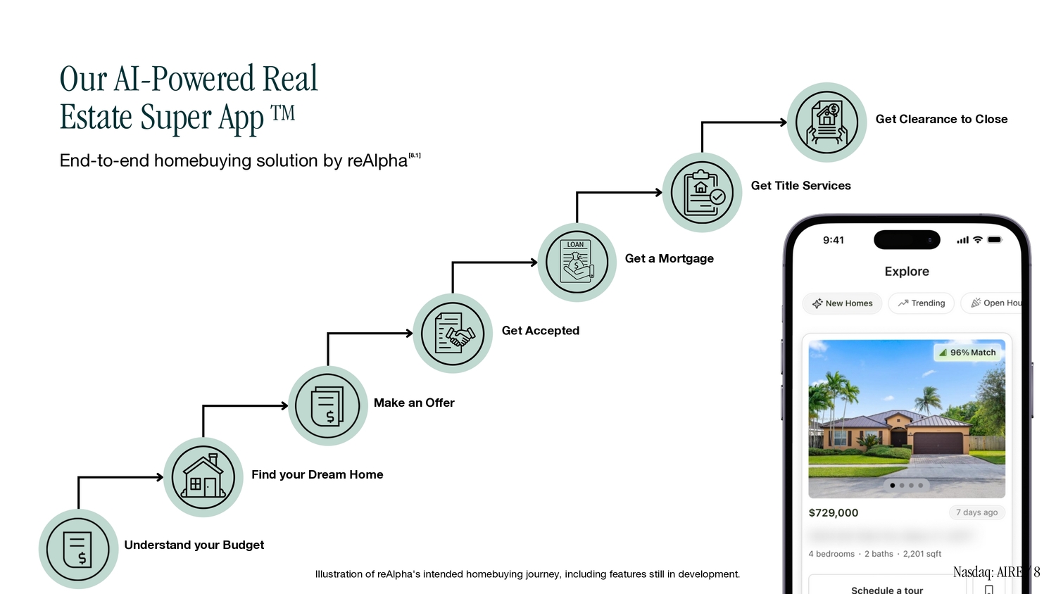 Get a Mortgage Make an Offer Get Accepted Understand your Budget Find your Dream Home Get Title Services Get Clearance to Close Our AI - Powered Real Estate Super App TM Nasdaq: AIRE / 8 End - to - end homebuying solution by reAlpha [8.1] Illustration of reAlpha's intended homebuying journey, including features still in development.