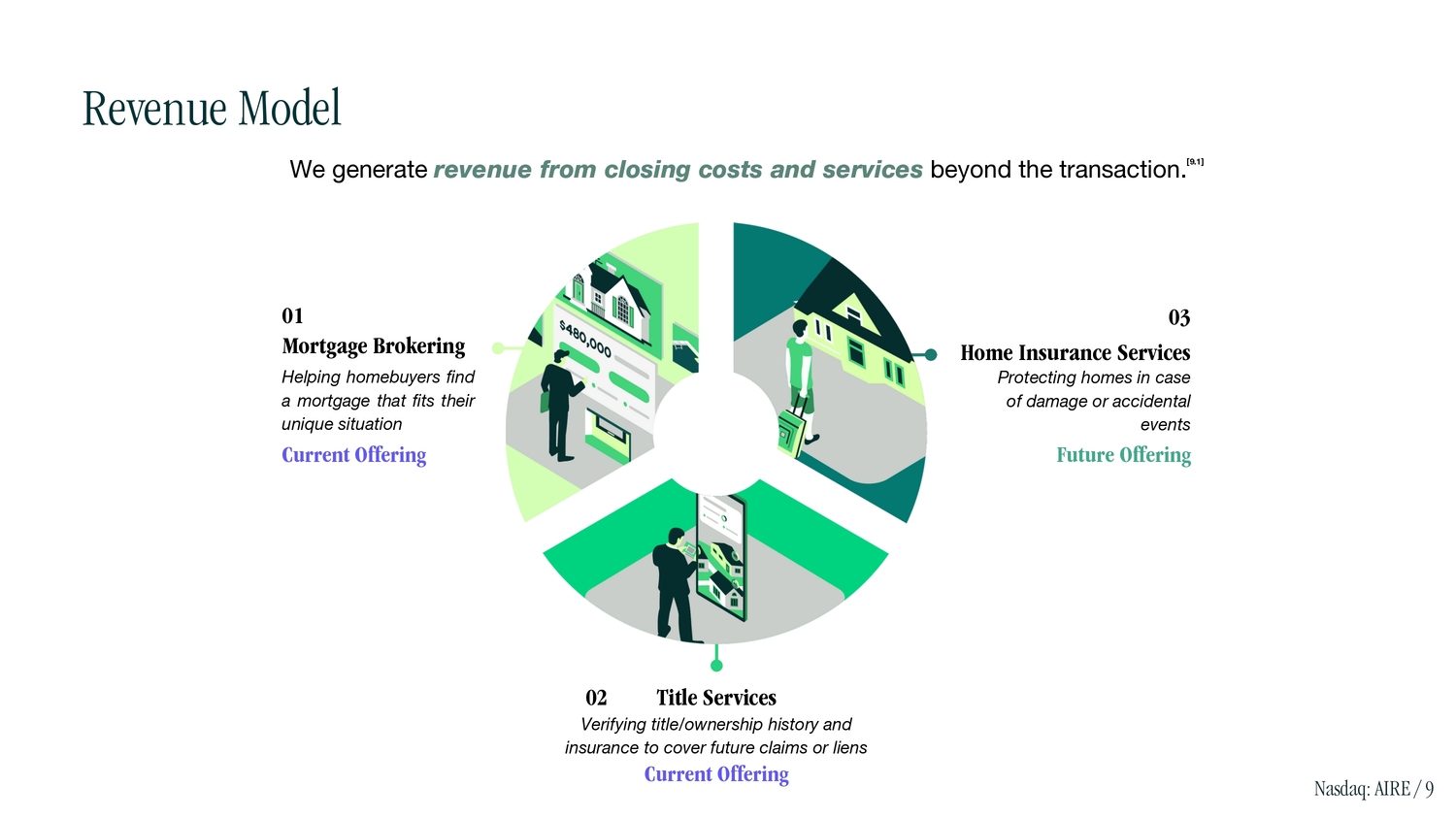 We generate revenue from closing costs and services beyond the transaction. [9.1] 01 Mortgage Brokering Helping homebuyers find a mortgage that fits their unique situation Current Offering 03 Home Insurance Services Protecting homes in case of damage or accidental events Future Offering Current Offering 02 Title Services Verifying title/ownership history and insurance to cover future claims or liens Revenue Model Nasdaq: AIRE / 9