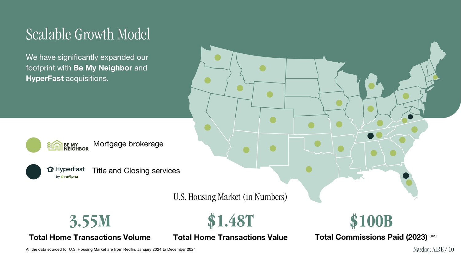 Scalable Growth Model We have significantly expanded our footprint with Be My Neighbor and HyperFast acquisitions . Mortgage brokerage Title and Closing services U.S. Housing Market (in Numbers) $100B Total Commissions Paid (2023) [10.1] Nasdaq: AIRE / 10 All the data sourced for U.S. Housing Market are from Redfin , January 2024 to December 2024 3.55M Total Home Transactions Volume $1.48T Total Home Transactions Value