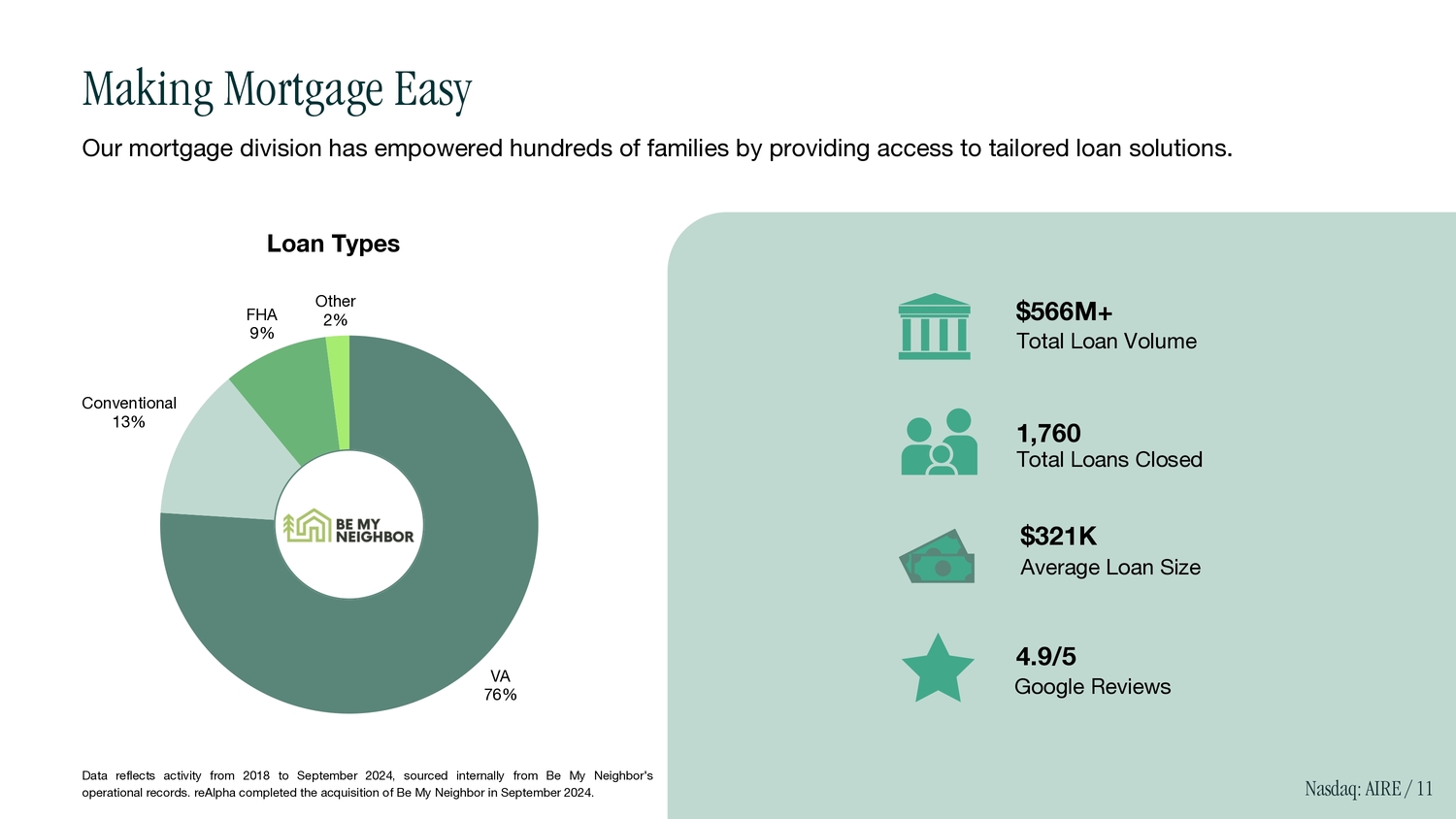 VA 76% Conventional 13% FHA 9% Other 2% $566M+ Total Loan Volume 1,760 Total Loans Closed $321K Average Loan Size 4.9/5 Google Reviews Our mortgage division has empowered hundreds of families by providing access to tailored loan solutions. Loan Types Data reflects activity from 2018 to September 2024, sourced internally from Be My Neighbor's operational records. reAlpha completed the acquisition of Be My Neighbor in September 2024. Making Mortgage Easy Nasdaq: AIRE / 11