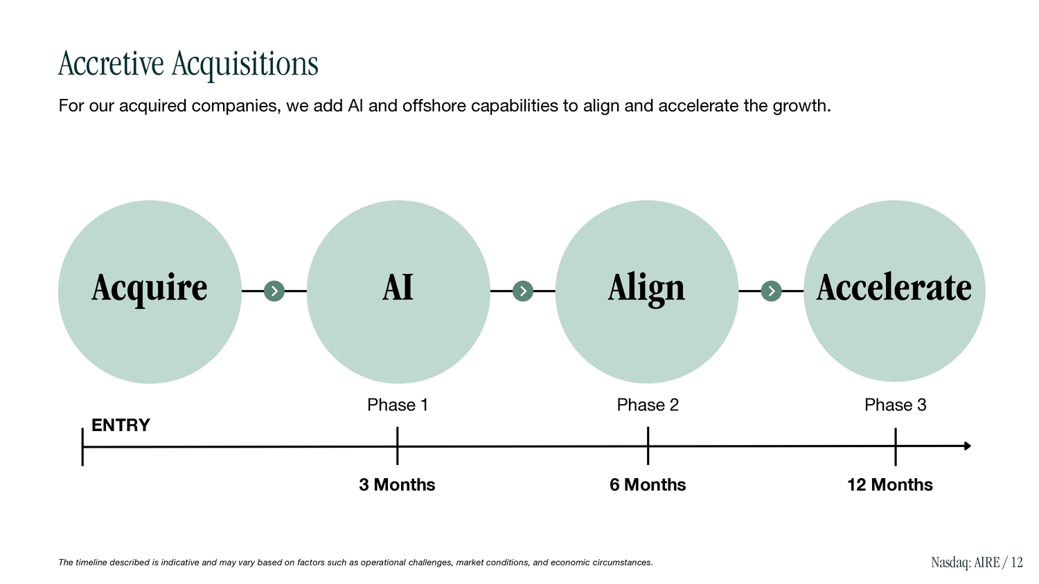 For our acquired companies, we add AI and offshore capabilities to align and accelerate the growth. Accretive Acquisitions Acquire AI Align Accelerate ENTRY 3 Months 6 Months 12 Months Phase 1 Phase 2 Phase 3 Nasdaq: AIRE / 12 The timeline described is indicative and may vary based on factors such as operational challenges, market conditions, and economic circumstances.