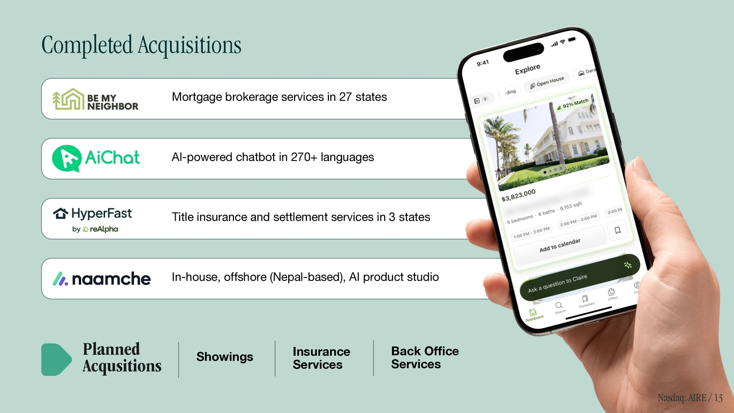 Mortgage brokerage services in 27 states AI - powered chatbot in 270+ languages Title insurance and settlement services in 3 states In - house, offshore (Nepal - based), AI product studio Planned Acqusitions Completed Acquisitions Showings Insurance Services Back Office Services Nasdaq: AIRE / 13