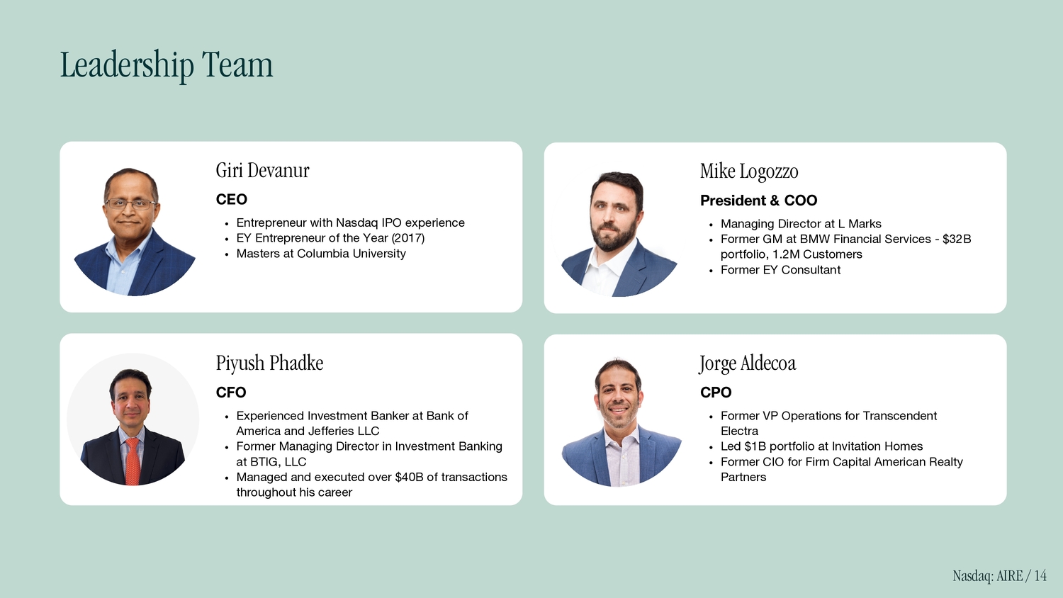 Giri Devanur CEO Entrepreneur with Nasdaq IPO experience EY Entrepreneur of the Year (2017) Masters at Columbia University Nasdaq: AIRE / 14 Piyush Phadke CFO Experienced Investment Banker at Bank of America and Jefferies LLC Former Managing Director in Investment Banking at BTIG, LLC Managed and executed over $40B of transactions throughout his career Leadership Team Mike Logozzo President & COO Managing Director at L Marks Former GM at BMW Financial Services - $32B portfolio, 1.2M Customers Former EY Consultant Jorge Aldecoa CPO Former VP Operations for Transcendent Electra Led $1B portfolio at Invitation Homes Former CIO for Firm Capital American Realty Partners