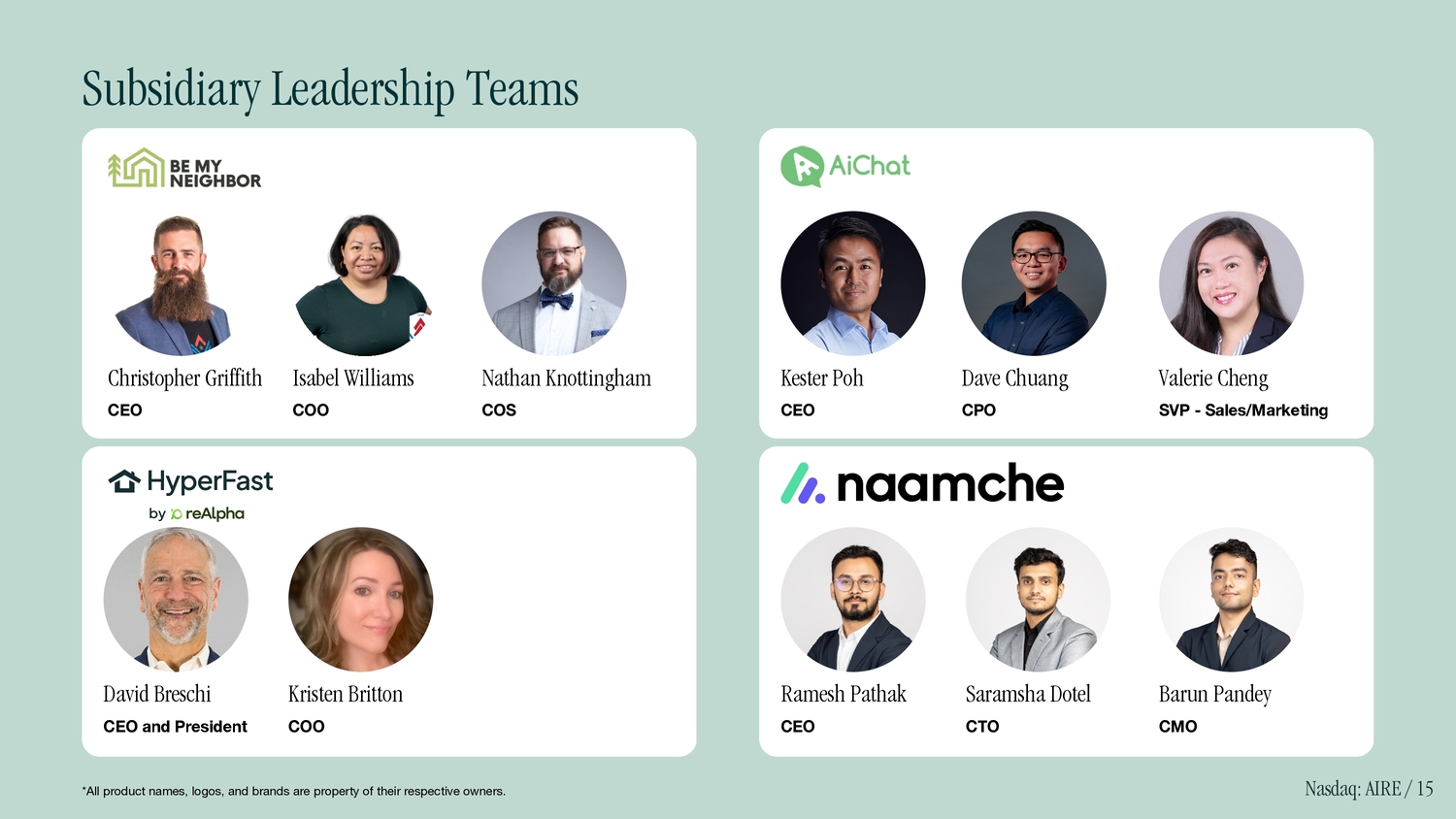 Christopher Griffith CEO Isabel Williams COO Nathan Knottingham COS Kester Poh CEO Dave Chuang CPO Valerie Cheng SVP - Sales/Marketing David Breschi CEO and President Kristen Britton COO *All product names, logos, and brands are property of their respective owners. Ramesh Pathak CEO Saramsha Dotel CTO Barun Pandey CMO Subsidiary Leadership Teams Nasdaq: AIRE / 15
