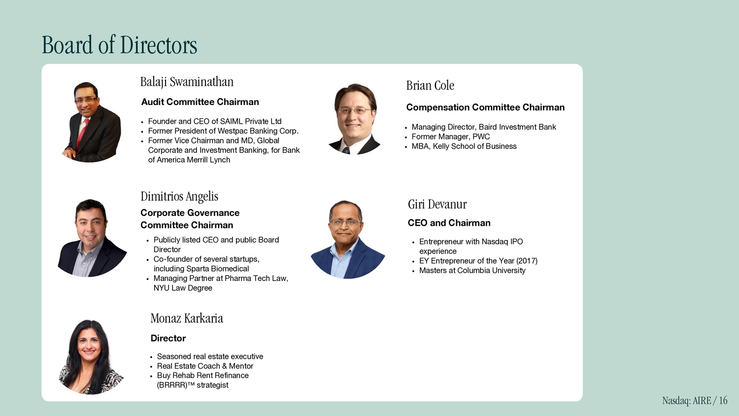 Brian Cole Compensation Committee Chairman Managing Director, Baird Investment Bank Former Manager, PWC MBA, Kelly School of Business Giri Devanur CEO and Chairman Entrepreneur with Nasdaq IPO experience EY Entrepreneur of the Year (2017) Masters at Columbia University Balaji Swaminathan Audit Committee Chairman Founder and CEO of SAIML Private Ltd Former President of Westpac Banking Corp. Former Vice Chairman and MD, Global Corporate and Investment Banking, for Bank of America Merrill Lynch Dimitrios Angelis Corporate Governance Committee Chairman Publicly listed CEO and public Board Director Co - founder of several startups, including Sparta Biomedical Managing Partner at Pharma Tech Law, NYU Law Degree Monaz Karkaria Director Seasoned real estate executive Real Estate Coach & Mentor Buy Rehab Rent Refinance (BRRRR) strategist Board of Directors Nasdaq: AIRE / 16