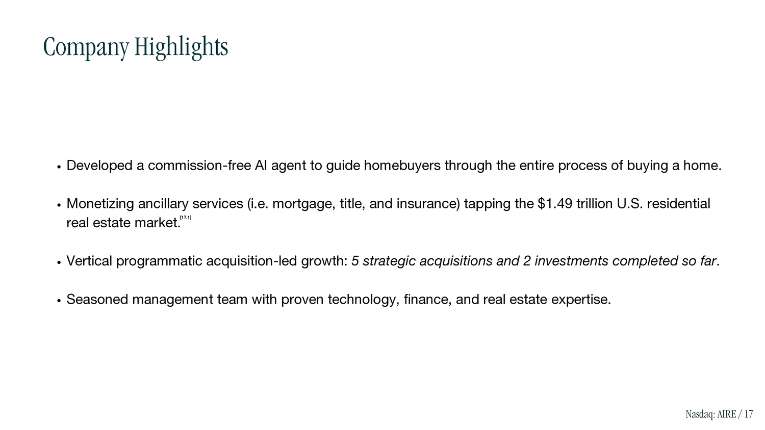Developed a commission - free AI agent to guide homebuyers through the entire process of buying a home. Monetizing ancillary services (i.e. mortgage, title, and insurance) tapping the $1.49 trillion U.S. residential real estate market. Vertical programmatic acquisition - led growth: 5 strategic acquisitions and 2 investments completed so far . Seasoned management team with proven technology, finance, and real estate expertise. [17.1] Company Highlights Nasdaq: AIRE / 17