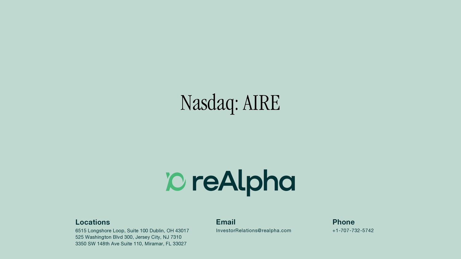 Nasdaq: AIRE Phone +1 - 707 - 732 - 5742 Email InvestorRelations@realpha.com Locations 6515 Longshore Loop, Suite 100 Dublin, OH 43017 525 Washington Blvd 300, Jersey City, NJ 7310 3350 SW 148th Ave Suite 110, Miramar, FL 33027