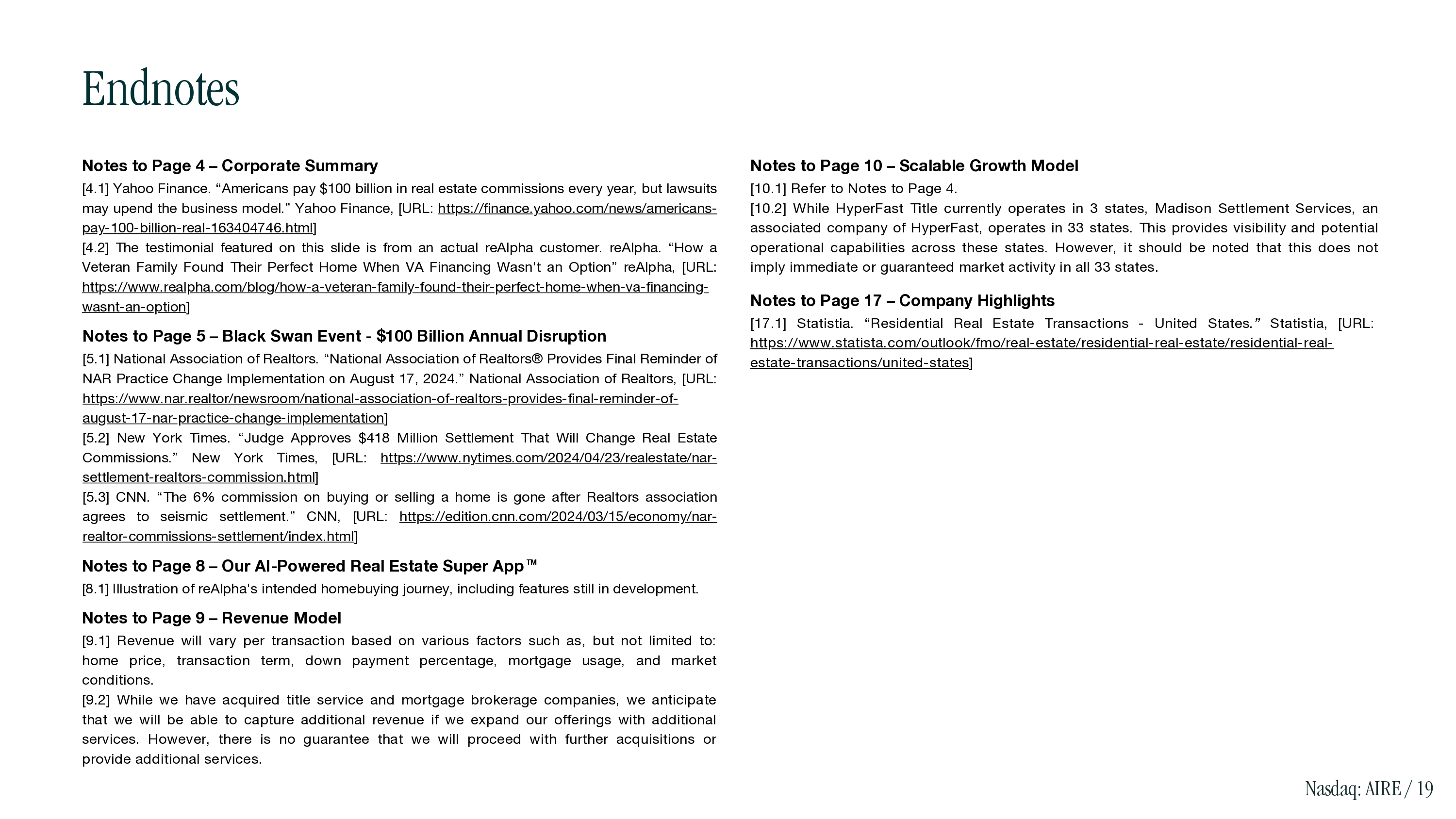 Endnotes Notes to Page 4 – Corporate Summary [ 4 . 1 ] Yahoo Finance . “Americans pay $ 100 billion in real estate commissions every year, but lawsuits may upend the business model . ” Yahoo Finance, [URL : https : //finance . yahoo . com/news/americans - pay - 100 - billion - real - 163404746 . html ] [4.2] The testimonial featured on this slide is from an actual reAlpha customer. reAlpha. “How a Veteran Family Found Their Perfect Home When VA Financing Wasn't an Option” reAlpha, [URL: https://www.realpha.com/blog/how - a - veteran - family - found - their - perfect - home - when - va - financing - wasnt - an - option ] Notes to Page 5 – Black Swan Event - $100 Billion Annual Disruption [5.1] National Association of Realtors. “National Association of Realtors® Provides Final Reminder of NAR Practice Change Implementation on August 17, 2024.” National Association of Realtors, [URL: https://www.nar.realtor/newsroom/national - association - of - realtors - provides - final - reminder - of - august - 17 - nar - practice - change - implementation ] [ 5 . 2 ] New York Times . “Judge Approves $ 418 Million Settlement That Will Change Real Estate Commissions . ” New York Times, [URL : https : //www . nytimes . com/ 2024 / 04 / 23 /realestate/nar - settlement - realtors - commission . html ] [ 5 . 3 ] CNN . “The 6 % commission on buying or selling a home is gone after Realtors association agrees to seismic settlement . ” CNN, [URL : https : //edition . cnn . com/ 2024 / 03 / 15 /economy /nar - realtor - commissions - settlement/index . html ] Notes to Page 8 – Our AI - Powered Real Estate Super App TM [8.1] Illustration of reAlpha's intended homebuying journey, including features still in development. Notes to Page 9 – Revenue Model [ 9 . 1 ] Revenue will vary per transaction based on various factors such as, but not limited to : home price, transaction term, down payment percentage, mortgage usage, and market conditions . [ 9 . 2 ] While we have acquired title service and mortgage brokerage companies, we anticipate that we will be able to capture additional revenue if we expand our offerings with additional services . However, there is no guarantee that we will proceed with further acquisitions or provide additional services . Notes to Page 10 – Scalable Growth Model [ 10 . 1 ] Refer to Notes to Page 4 . [ 10 . 2 ] While HyperFast Title currently operates in 3 states, Madison Settlement Services, an associated company of HyperFast, operates in 33 states . This provides visibility and potential operational capabilities across these states . However, it should be noted that this does not imply immediate or guaranteed market activity in all 33 states . Notes to Page 17 – Company Highlights [17.1] Statistia. “Residential Real Estate Transactions - United States .” Statistia, [URL: https://www.statista.com/outlook/fmo/real - estate/residential - real - estate/residential - real - estate - transactions/united - states ] Nasdaq: AIRE / 19