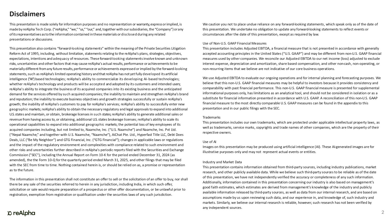 Disclaimers 2 This presentation is made solely for information purposes and no representation or warranty, express or implied, is madebyreAlpha Tech Corp. (“reAlpha,” “we,” “us,” “our,” and, together with oursubsidiaries, the “Company”) orany of its representatives as to the information contained inthesematerials or disclosed during any related presentations or discussions. This presentation also contains “forward - looking statements” within the meaning of the Private Securities Litigation Reform Act of 1995, including, without limitation, statements relating to the reAlpha’s plans, strategies, objectives, expectations, intentions and adequacy of resources. These forward - looking statements involve known and unknown risks, uncertainties and other factors that may cause reAlpha’s actual results, performance or achievements to be materiallydifferent fromany futureresults, performanceor achievements expressed or implied by the forward - looking statements, such as reAlpha’s limited operating history and that reAlpha has not yet fully developed its artificial intelligence ("AI") based technologies; reAlpha’s ability to commercialize its developing AI - based technologies; whether reAlpha’s technology and products will be accepted and adopted by its customers and intended users; reAlpha's ability to integrate the business of its acquired companies into its existing business and the anticipated demand for the services offered by such acquired companies; the inability to maintain and strengthen reAlpha’s brand and reputation; the inability to execute business objectives and growth strategies successfully or sustain reAlpha’s growth; the inability of reAlpha’s customers to pay for reAlpha’s services; reAlpha’s ability to successfully enter new geographic markets; reAlpha’s ability to obtain the necessary regulatory and legal approvals to expand into additional U.S. states and maintain, or obtain, brokerage licenses in such states; reAlpha’s ability to generate additional sales or revenue from having access to, or obtaining, additional U.S. states brokerage licenses; reAlpha’s ability to scale its operational capabilities to expand into additional geographic markets; the potential loss of key employees of its acquired companies including, but not limited to, Naamche, Inc. (“U.S. Naamche”) and Naamche, Inc. Pvt Ltd. (“Nepal Naamche,” and together with U.S. Naamche, “Naamche”), AiChat Pte. Ltd., Hyperfast Title LLC, Debt Does Deals, LLC (“Be My Neighbor”) and GTG Financial, Inc. (“GTG Financial”); changes in applicable laws or regulations and the impact of the regulatory environment and complexities with compliance related to such environment and other risks and uncertainties further described in reAlpha's periodic reports filed with the Securities and Exchange Commission ("SEC"), including the Annual Report on Form 10 - K for the period ended December 31, 2024 (as amended), the the Form 10 - Q for the quarterly period ended March 31, 2025, and other filings that may be filed with the SEC from time to time. Nothing contained herein is, or should be relied on as, a promise or representation as to the future. The information in this presentation shall not constitute an offer to sell or the solicitation of an offer to buy, nor shall there be any sale of the securities referred to herein in any jurisdiction, including India, in which such offer, solicitation or sale would require preparation of a prospectus or other offer documentation, or be unlawful prior to registration, exemption from registration or qualification under the securities laws of any such jurisdiction. We caution you not to place undue reliance on any forward - looking statements, which speak only as of the date of this presentation. We undertake no obligation to update any forward - looking statements to reflect events or circumstances after the date of this presentation, except as required by law. Use of Non - U.S. GAAP Financial Measures This presentation includes Adjusted EBITDA, a financial measure that is not presented in accordance with generally accepted accounting principles in the United States (“U.S. GAAP”) and may be different from non - U.S. GAAP financial measures used by other companies. We reconcile our Adjusted EBITDA to our net income (loss) adjusted to exclude interest expense, depreciation and amortization, share based compensation, and other non - cash, non - operating, or non - recurring items that we believe are not indicative of our core business operations. We use Adjusted EBITDA to evaluate our ongoing operations and for internal planning and forecasting purposes. We believe that this non - U.S. GAAP financial measures may be helpful to investors because it provides consistency and comparability with past financial performance. This non - U.S. GAAP financial measure is presented for supplemental informational purposes only, has limitations as an analytical tool, and should not be considered in isolation or as a substitute for financial information presented in accordance with U.S. GAAP. A reconciliation of this non - U.S. GAAP financial measure to the most directly comparable U.S. GAAP measures can be found in the appendix to this presentation and in our public filings with the SEC. Trademarks This presentation includes our own trademarks, which are protected under applicable intellectual property laws, as well as trademarks, service marks, copyrights and trade names of other companies, which are the property of their respective owners . Use of AI Images on this presentation may be produced using artificial intelligence (AI). These AI - generated images are for illustrative purposes only and may not represent actual events or entities. Industry and Market Data This presentation contains information obtained from third - party sources, including industry publications, market research, and other publicly available data. While we believe 