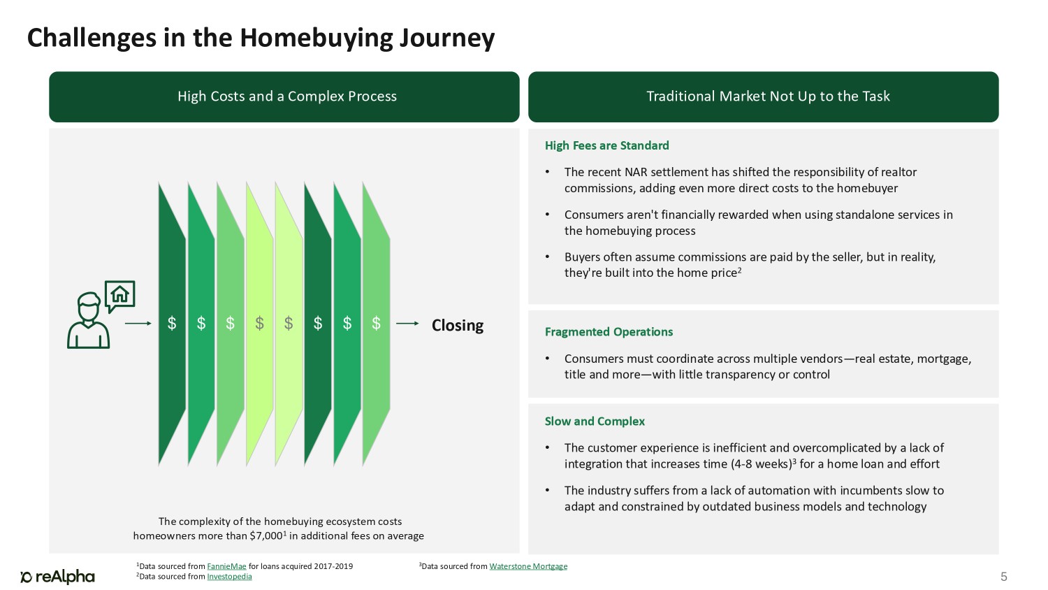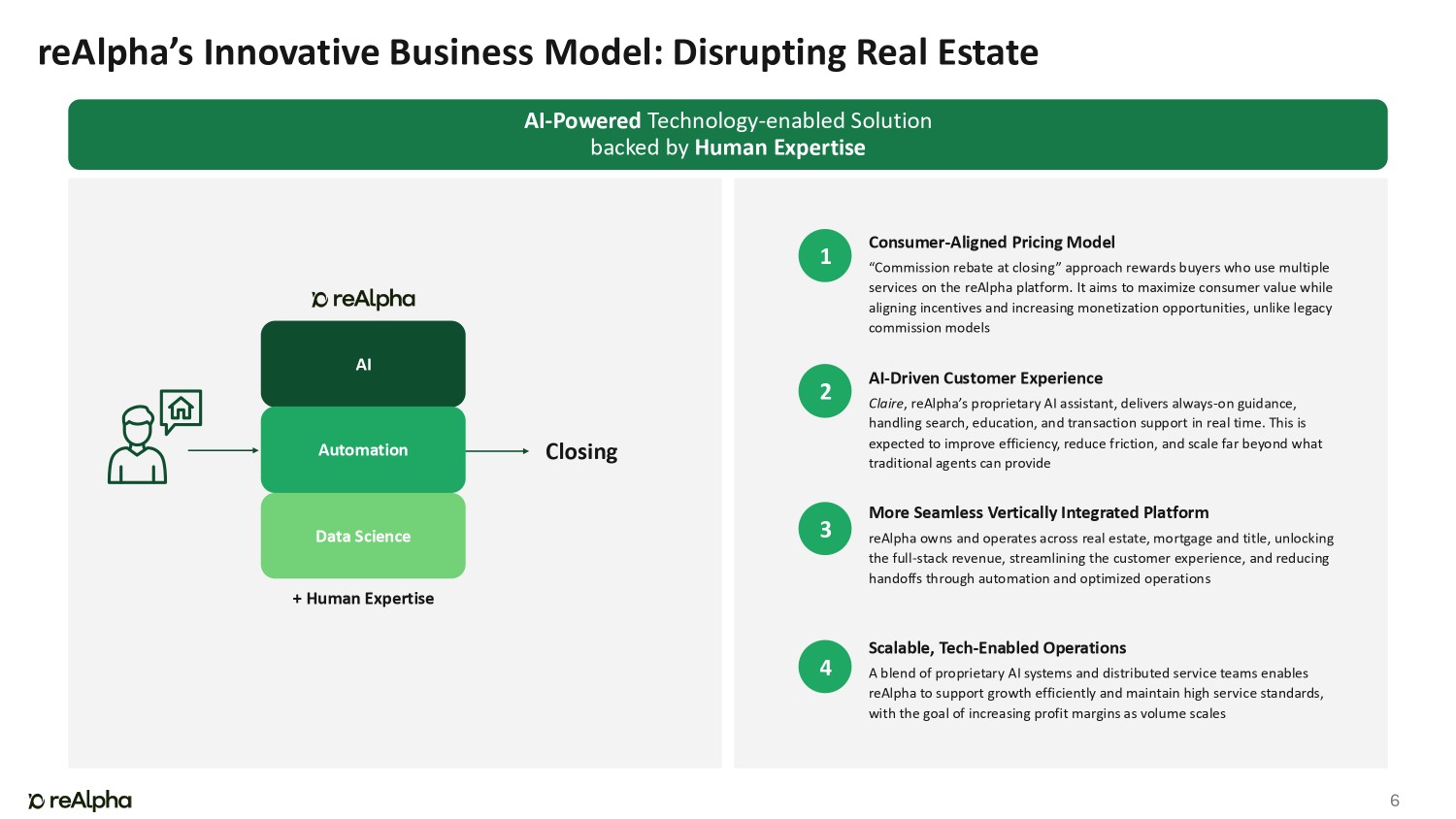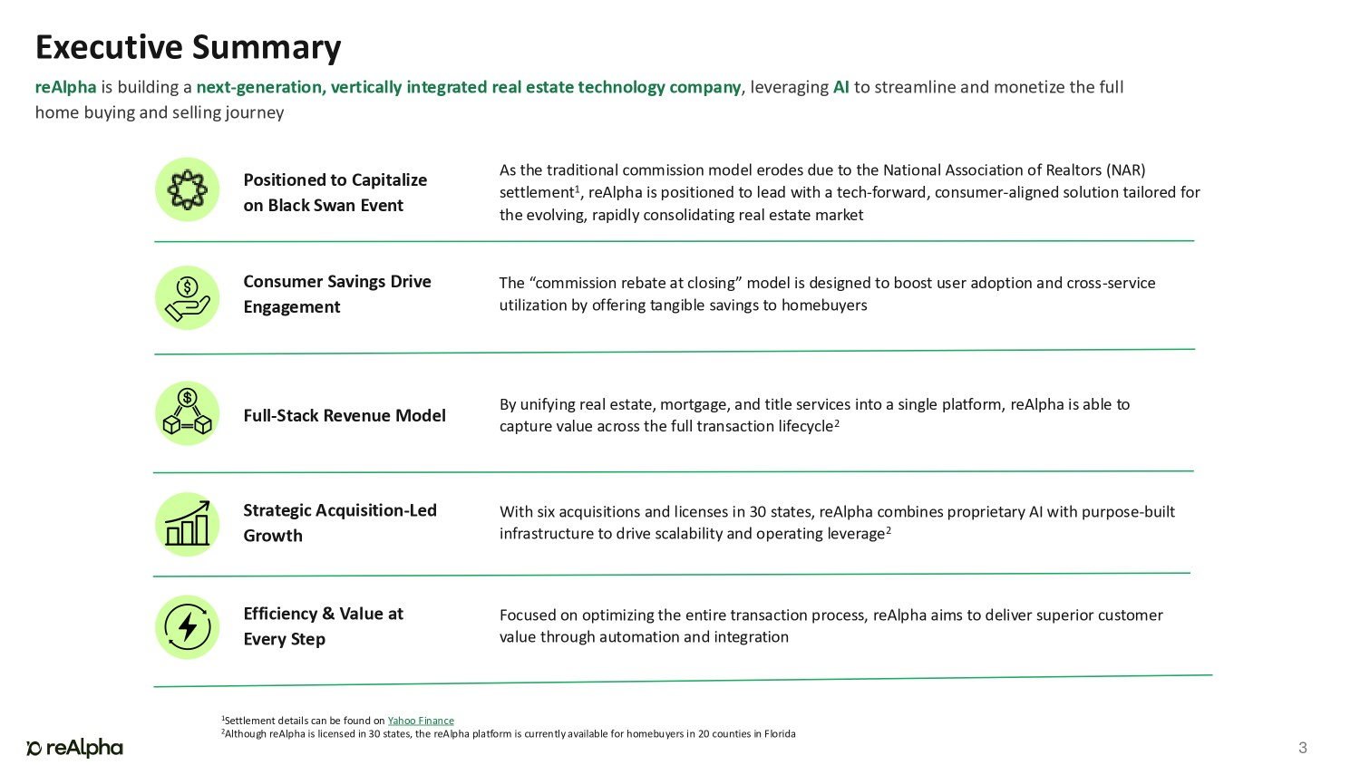 Executive Summary reAlpha is building a next - generation, vertically integrated real estate technology company , leveraging AI to streamline and monetize the full home buying and selling journey Full - Stack Revenue Model By unifying real estate, mortgage, and title services into a single platform, reAlpha is able to capture value across the full transaction lifecycle 2 Strategic Acquisition - Led Growth With six acquisitions and licenses in 30 states, reAlpha combines proprietary AI with purpose - built infrastructure to drive scalability and operating leverage 2 Positioned to Capitalize on Black Swan Event As the traditional commission model erodes due to the National Association of Realtors (NAR) settlement 1 , reAlpha is positioned to lead with a tech - forward, consumer - aligned solution tailored for the evolving, rapidly consolidating real estate market Efficiency & Value at Every Step Focused on optimizing the entire transaction process, reAlpha aims to deliver superior customer value through automation and integration Consumer Savings Drive Engagement The “commission rebate at closing” model is designed to boost user adoption and cross - service utilization by offering tangible savings to homebuyers 3 1 Settlement details can be found on Yahoo Finance 2 Although reAlpha is licensed in 30 states, the reAlpha platform is currently available for homebuyers in 20 counties in Florida