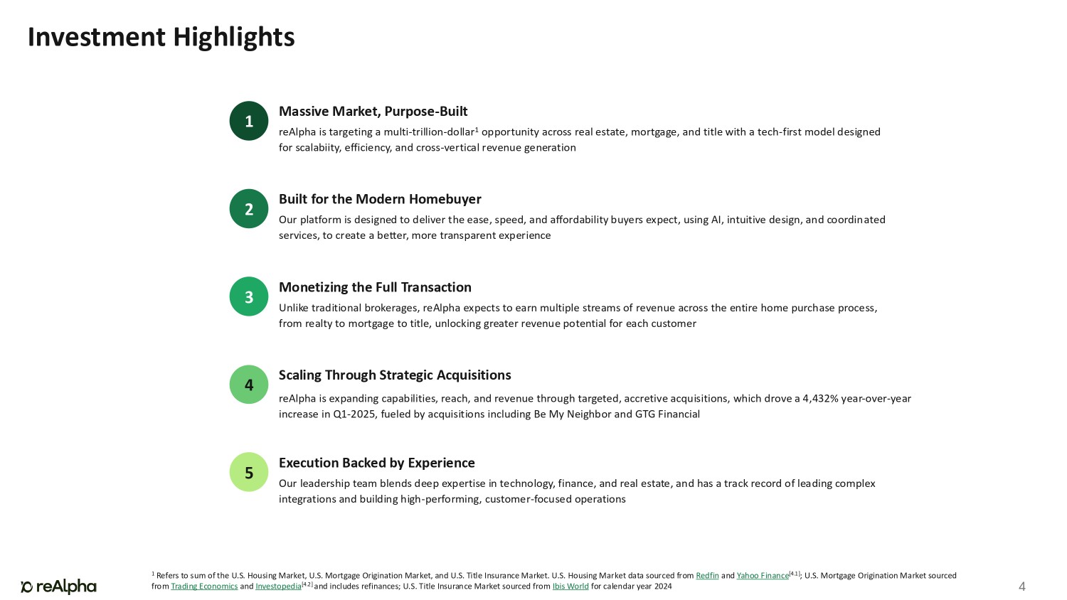 Investment Highlights Massive Market, Purpose - Built reAlpha is targeting a multi - trillion - dollar 1 opportunity across real estate, mortgage, and title with a tech - first model designed for scalabiity, efficiency, and cross - vertical revenue generation 1 Built for the Modern Homebuyer Our platform is designed to deliver the ease, speed, and affordability buyers expect, using AI, intuitive design, and coordinated services, to create a better, more transparent experience 2 Monetizing the Full Transaction Unlike traditional brokerages, reAlpha expects to earn multiple streams of revenue across the entire home purchase process, from realty to mortgage to title, unlocking greater revenue potential for each customer 3 Scaling Through Strategic Acquisitions reAlpha is expanding capabilities, reach, and revenue through targeted, accretive acquisitions, which drove a 4,432% year - over - year increase in Q1 - 2025, fueled by acquisitions including Be My Neighbor and GTG Financial 4 Execution Backed by Experience Our leadership team blends deep expertise in technology, finance, and real estate, and has a track record of leading complex integrations and building high - performing, customer - focused operations 5 4 1 Refers to sum of the U.S. Housing Market, U.S. Mortgage Origination Market, and U.S. Title Insurance Market. U.S. Housing Market data sourced from Redfin and Yahoo Finance [4.1] ; U.S. Mortgage Origination Market sourced from Trading Economics and Investopedia [4.2] and includes refinances; U.S. Title Insurance Market sourced from Ibis World for calendar year 2024