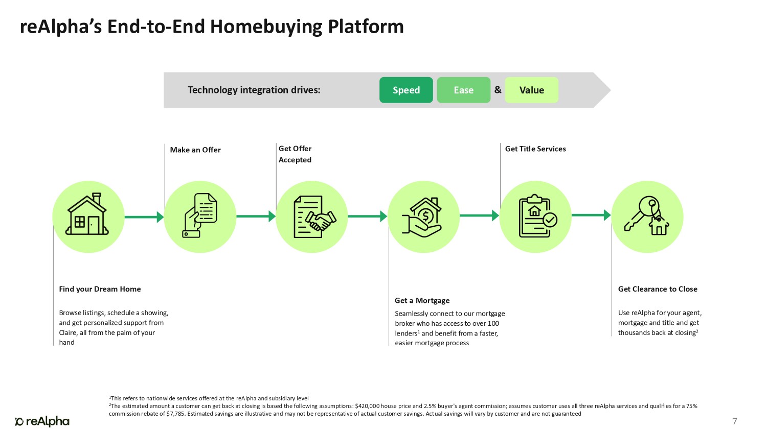 reAlpha’s Innovative Business Model: Disrupting Real Estate AI - Powered Technology - enabled Solution backed by Human Expertise AI Automation Data Science + Human Expertise Consumer - Aligned Pricing Model “Commission rebate at closing” approach rewards buyers who use multiple services on the reAlpha platform . It aims to maximize consumer value while aligning incentives and increasing monetization opportunities, unlike legacy commission models 1 AI - Driven Customer Experience Claire , reAlpha’s proprietary AI assistant, delivers always - on guidance, handling search, education, and transaction support in real time. This is expected to improve efficiency, reduce friction, and scale far beyond what traditional agents can provide 2 More Seamless Vertically Integrated Platform reAlpha owns and operates across real estate, mortgage and title, unlocking the full - stack revenue, streamlining the customer experience, and reducing handoffs through automation and optimized operations 3 Scalable, Tech - Enabled Operations A blend of proprietary AI systems and distributed service teams enables reAlpha to support growth efficiently and maintain high service standards, with the goal of increasing profit margins as volume scales 4 Closing 6