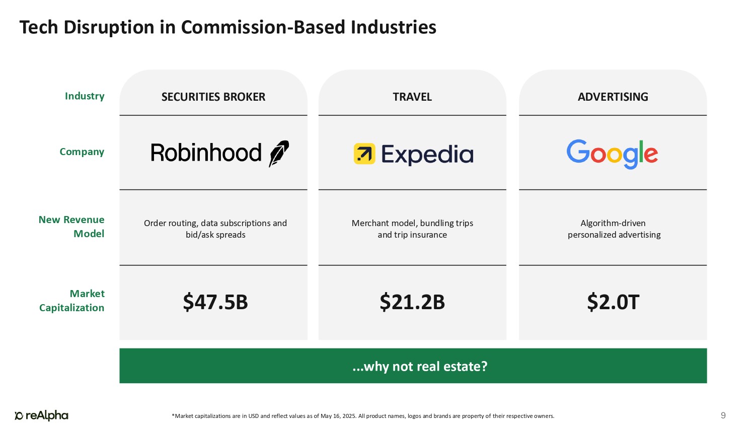 Total Addressable Market Expansion Through Complementary Real Estate Services U.S. Housing Market ~$80B Total Commissions Paid (2024) U.S. Housing Market data sourced from Redfin and Yahoo Finance [4.1] $1.5T Total Home Transactions Value ~$18B Total Mortgage Broker Commissions $1.7T Total Value of Mortgages Originated ~$23B Total Title Insurance Revenue 8 U.S. Mortgage Origination Market U.S. Title Insurance Market U.S. Title Insurance Market sourced from Ibis World for calendar year 2024 By integrating real estate , mortgage and title into a unified platform, reAlpha captures value across the entire home buying transaction lifecycle U.S. Mortgage Origination Market sourced from Trading Economics and Investopedia [4.2] and includes refinances