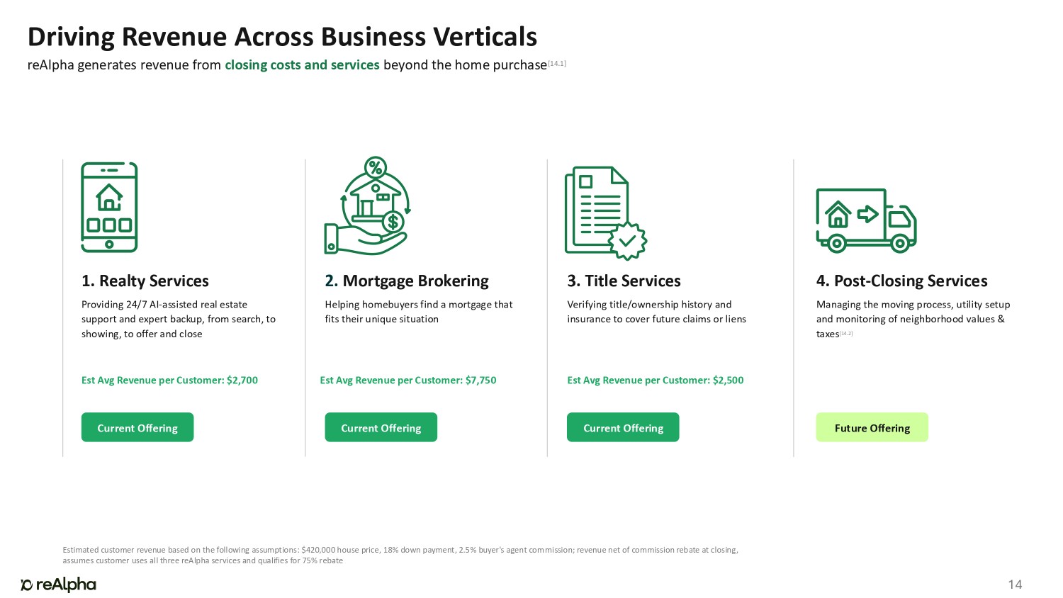 reAlpha’s Title Insurance Business Client - Focused and Technology - Driven Delivers comprehensive, digital title services to meet the dynamic needs of reAlpha customers Reliable and Secure By collaborating with underwriters, reAlpha offers customers protection against loss. Security systems are regularly updated and certified by independent security experts Best Practices Compliance Committed to ongoing compliance with industry best practices, maintaining the highest standards in all our operations Comprehensive Title Services Title Insurance Residential Closing Services Escrow Services reAlpha is pursuing partnerships to expand the reAlpha platform into new geographic markets, with the intent to offer real estate services nationwide 13