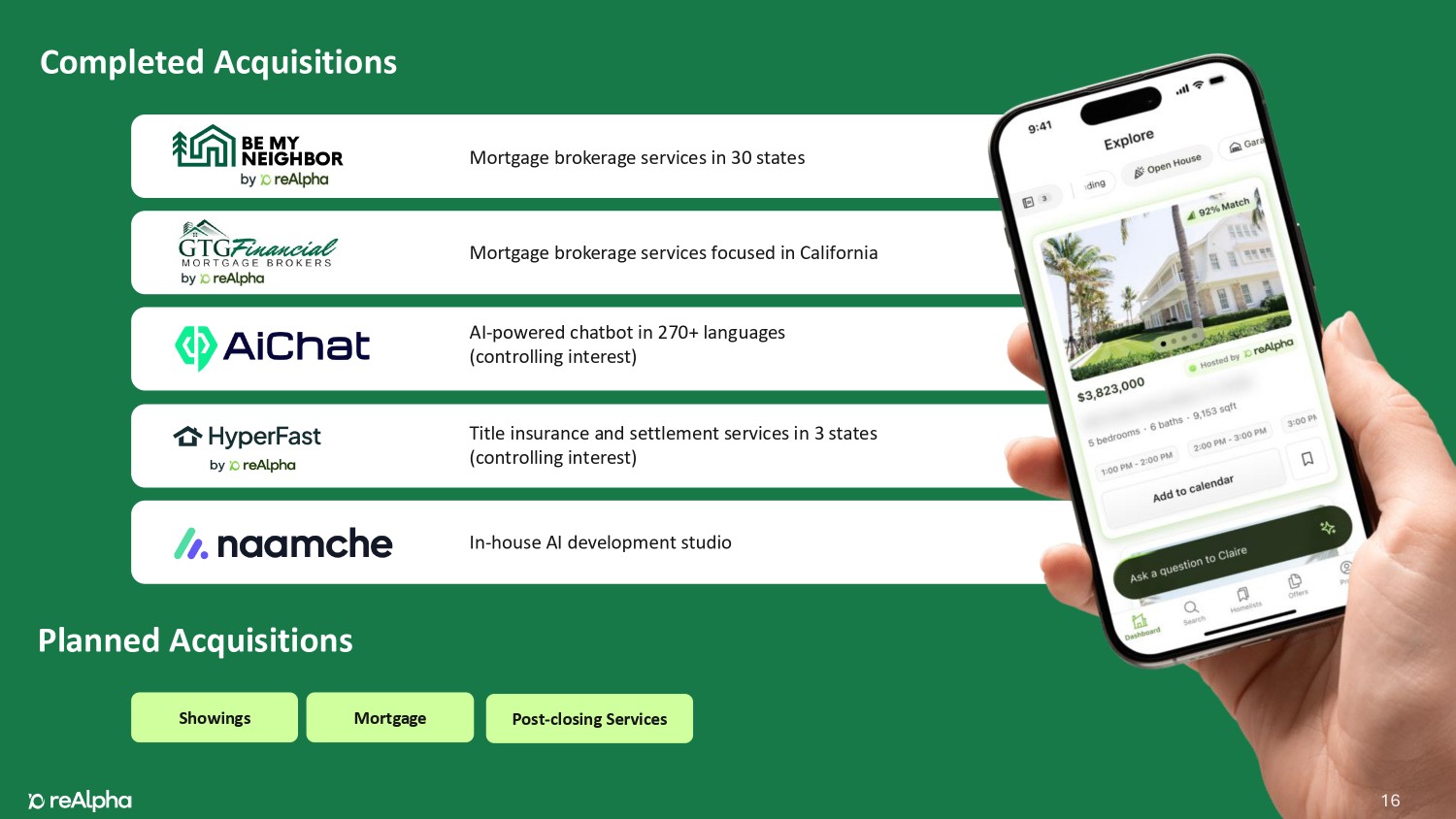 Scalable Growth Model Multi - point expansion strategy Geographic Footprint Expansion • reAlpha’s goal is to continue expanding to additional states and add state licenses to the portfolio Service Expansion • Increase services where reAlpha does not have a full suite of homebuying services in place • Attract service partners to reAlpha’s vertically - integrated ecosystem Market Share Penetration • Build a larger network of service personnel through agent recruitment strategies and acquisitions • Offer a more affordable, streamlined experience that generates organic customer interest • Implement AI - driven tech - enabled processes that increases transaction capacity for service personnel We have presence in 30 markets 15