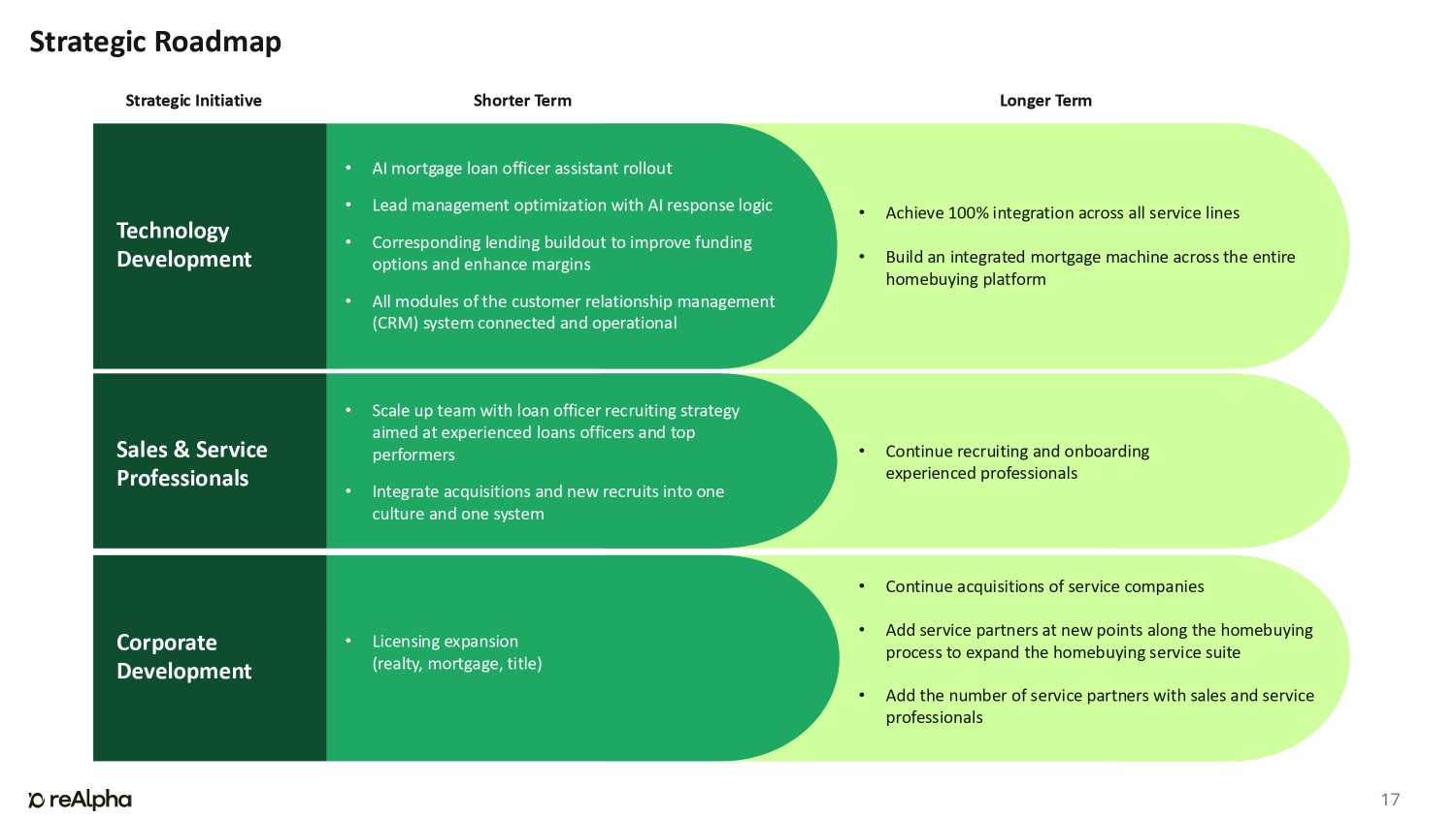 Completed Acquisitions Mortgage brokerage services in 30 states Planned Acquisitions Mortgage brokerage services focused in California AI - powered chatbot in 270+ languages (controlling interest) Title insurance and settlement services in 3 states (controlling interest) In - house AI development studio Showings Mortgage Post - closing Services 16