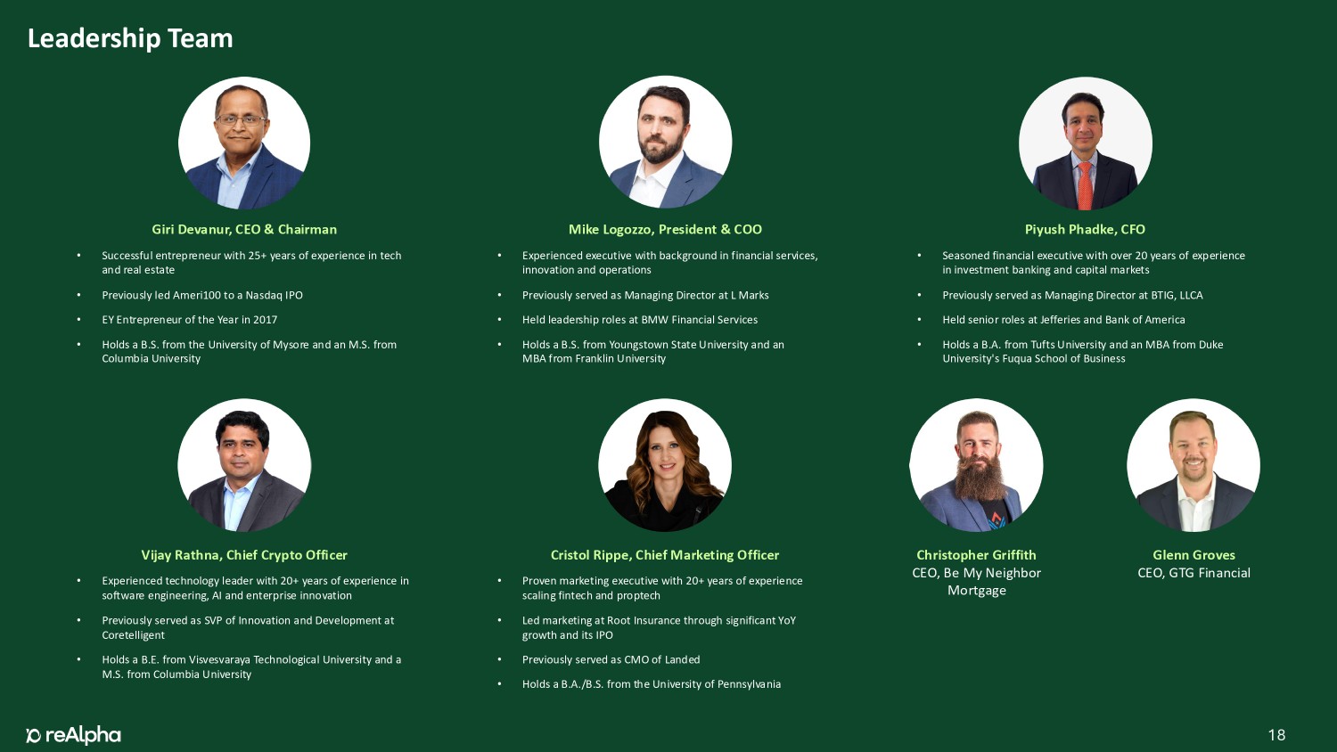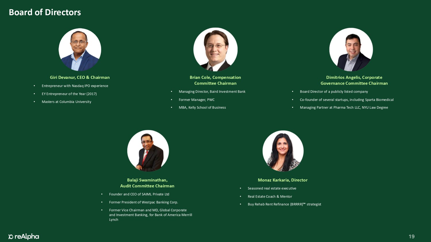 Leadership Team Giri Devanur, CEO & Chairman • Successful entrepreneur with 25+ years of experience in tech and real estate • Previously led Ameri100 to a Nasdaq IPO • EY Entrepreneur of the Year in 2017 • Holds a B.S. from the University of Mysore and an M.S. from Columbia University Mike Logozzo, President & COO • Experienced executive with background in financial services, innovation and operations • Previously served as Managing Director at L Marks • Held leadership roles at BMW Financial Services • Holds a B.S. from Youngstown State University and an MBA from Franklin University Piyush Phadke, CFO • Seasoned financial executive with over 20 years of experience in investment banking and capital markets • Previously served as Managing Director at BTIG, LLCA • Held senior roles at Jefferies and Bank of America • Holds a B.A. from Tufts University and an MBA from Duke University's Fuqua School of Business Vijay Rathna, Chief Crypto Officer • Experienced technology leader with 20+ years of experience in software engineering, AI and enterprise innovation • Previously served as SVP of Innovation and Development at Coretelligent • Holds a B.E. from Visvesvaraya Technological University and a M.S. from Columbia University Cristol Rippe, Chief Marketing Officer • Proven marketing executive with 20+ years of experience scaling fintech and proptech • Led marketing at Root Insurance through significant YoY growth and its IPO • Previously served as CMO of Landed • Holds a B.A./B.S. from the University of Pennsylvania Christopher Griffith CEO, Be My Neighbor Mortgage Glenn Groves CEO, GTG Financial 18