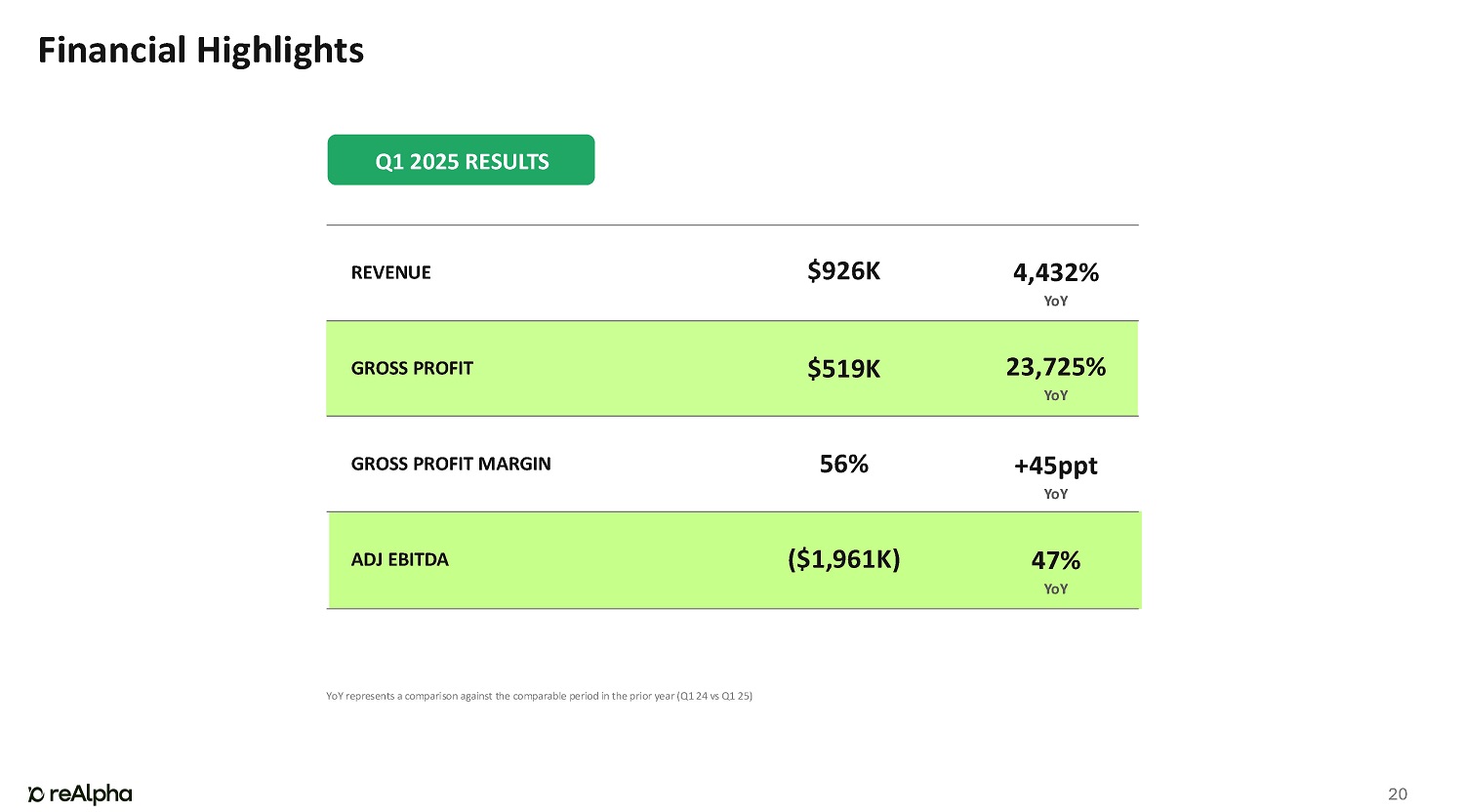 Financial Highlights Q1 2025 RESULTS Closed Loan Value represents combined value across Be My Neighbor Mortgage (acquired September 2024) and GTG Financial (acquired February 2025) YoY represents a comparison against the comparable period in the prior year (Q1 24 vs Q1 25) REVENUE $926K 4,432% YoY GROSS PROFIT $519K 23,725% YoY ADJ EBITDA ($1,961K) 47% YoY represents a comparison against the comparable period in the prior year (Q1 24 vs Q1 25)