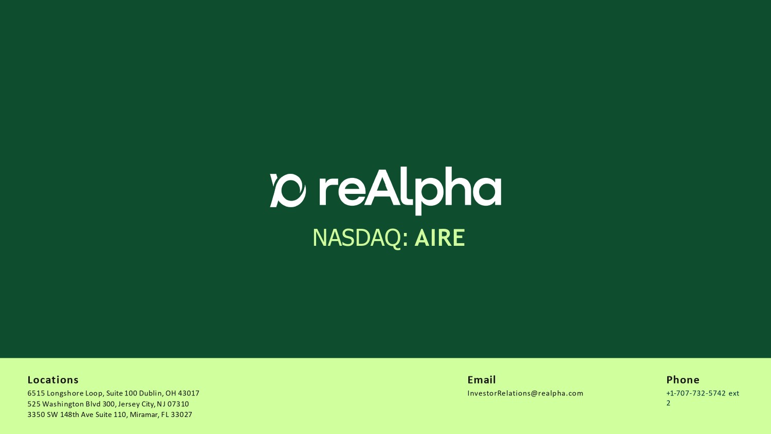 NASDAQ: AIRE Phone +1 - 707 - 732 - 5742 ext 2 Email InvestorRelations@realpha.com Locations 6515 Longshore Loop, Suite 100 Dublin, OH 43017 525 Washington Blvd 300, Jersey City, NJ 07310 3350 SW 148th Ave Suite 110, Miramar, FL 33027