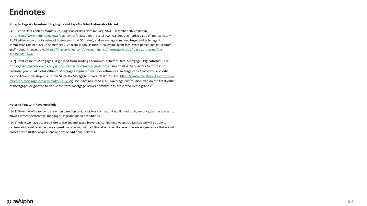Endnotes 22 Notes to Page 4 – Investment Highlights and Page 8 – Total Addressable Market [4.1] Redfin Data Center. "Monthly Housing Market Data from January 2024 - December 2024." Redfin, [URL: https://www.redfin.com/news/data - center/ ]. Based on the total 2024 U.S. housing market value of approximately $1.49 trillion (sum of total value of homes sold in all 50 states), and an average combined buyer and seller agent commission rate of 5.32% in September 2024 from Yahoo Finance. "Real estate agent fees: What percentage do Realtors get?" Yahoo Finance, [URL: https://finance.yahoo.com/personal - finance/mortgages/article/real - estate - agent - fees - 224457001.html ] [4.2] Total Value of Mortgages Originated from Trading Economics. “United State Mortgage Originations” (URL: https://tradingeconomics.com/united - states/mortgage - originations ). Sum of all 2024 quarters to represent calendar year 2024. Total Value of Mortgage Originated includes refinances. Average of 1 - 2% commission rate sourced from Investopedia . “How Much Do Mortgage Brokers Make?” (URL : https : //www . investopedia . com/how - much - do - mortgage - brokers - make - 5213979 ) . We have assumed a 1 . 1 % average commission rate on the total value of mortgages originated to derive the total mortgage broker commissions presented in the graphic . Notes to Page 14 – Revenue Model [14.1] Revenue will vary per transaction based on various factors such as, but not limited to: home price, transaction term, down payment percentage, mortgage usage and market conditions. [14.2] While we have acquired title service and mortgage brokerage companies, we anticipate that we will be able to capture additional revenue if we expand our offerings with additional services. However, there is no guarantee that we will proceed with further acquisitions or provide additional services.