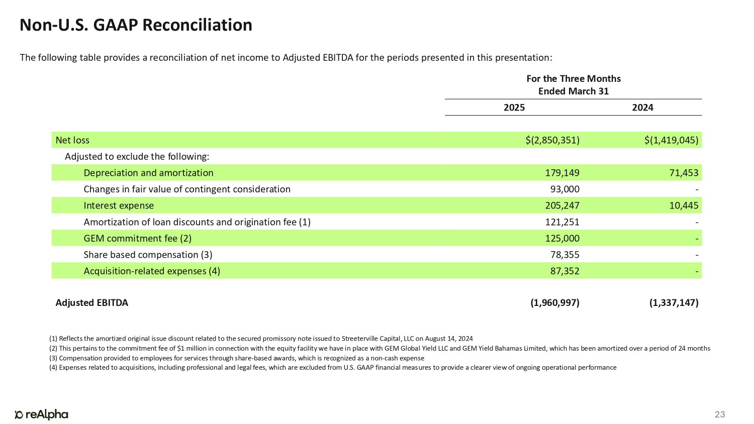 Non - U.S. GAAP Reconciliation 23 The following table provides a reconciliation of net income to Adjusted EBITDA for the periods presented in this presentation: (1) Reflects the amortized original issue discount related to the secured promissory note issued to Streeterville Capital, LLC on August 14, 2024 (2) This pertains to the commitment fee of $1 million in connection with the equity facility we have in place with GEM Global Yield LLC and GEM Yield Bahamas Limited, which has been amortized over a period of 24 months (3) Compensation provided to employees for services through share - based awards, which is recognized as a non - cash expense (4) Expenses related to acquisitions, including professional and legal fees, which are excluded from U.S. GAAP financial measures to provide a clearer view of ongoing operational performance For the Three Months Ended March 31 2024 2025 $(1,419,045) $(2,850,351) Net loss Adjusted to exclude the following: 71,453 179,149 Depreciation and amortization - 93,000 Changes in fair value of contingent consideration 10,445 205,247 Interest expense - 121,251 Amortization of loan discounts and origination fee (1) - 125,000 GEM commitment fee (2) - 78,355 Share based compensation (3) - 87,352 Acquisition - related expenses (4) (1,337,147) (1,960,997) Adjusted EBITDA
