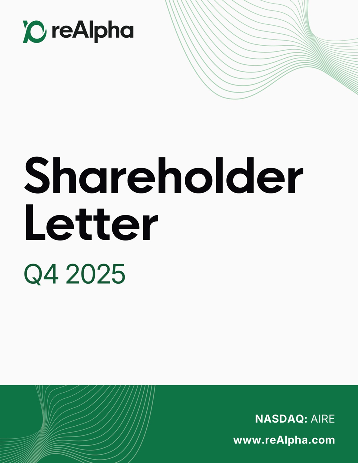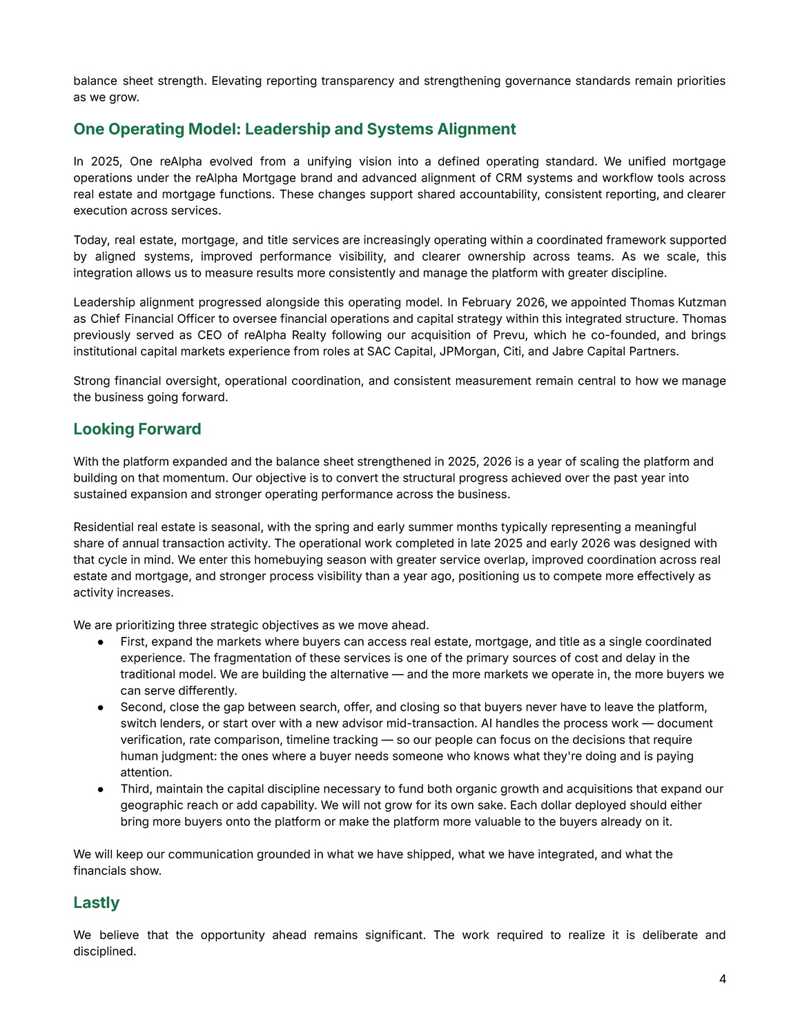 4 balance sheet strength . Elevating reporting transparency and strengthening governance standards remain priorities as we grow . One Operating Model: Leadership and Systems Alignment In 2025 , One reAlpha evolved from a unifying vision into a defined operating standard . We unified mortgage operations under the reAlpha Mortgage brand and advanced alignment of CRM systems and workflow tools across real estate and mortgage functions . These changes support shared accountability, consistent reporting, and clearer execution across services . Today, real estate, mortgage, and title services are increasingly operating within a coordinated framework supported by aligned systems, improved performance visibility, and clearer ownership across teams . As we scale, this integration allows us to measure results more consistently and manage the platform with greater discipline . Leadership alignment progressed alongside this operating model . In February 2026 , we appointed Thomas Kutzman as Chief Financial Officer to oversee financial operations and capital strategy within this integrated structure . Thomas previously served as CEO of reAlpha Realty following our acquisition of Prevu, which he co - founded, and brings institutional capital markets experience from roles at SAC Capital, JPMorgan, Citi, and Jabre Capital Partners . Strong financial oversight, operational coordination, and consistent measurement remain central to how we manage the business going forward . Looking Forward With the platform expanded and the balance sheet strengthened in 2025, 2026 is a year of scaling the platform and building on that momentum. Our objective is to convert the structural progress achieved over the past year into sustained expansion and stronger operating performance across the business. Residential real estate is seasonal, with the spring and early summer months typically representing a meaningful share of annual transaction activity. The operational work completed in late 2025 and early 2026 was designed with that cycle in mind. We enter this homebuying season with greater service overlap, improved coordination across real estate and mortgage, and stronger process visibility than a year ago, positioning us to compete more effectively as activity increases. We are prioritizing three strategic objectives as we move ahead. ● First, expand the markets where buyers can access real estate, mortgage, and title as a single coordinated experience. The fragmentation of these services is one of the primary sources of cost and delay in the traditional model. We are building the alternative — and the more markets we operate in, the more buyers we can serve differently. ● Second, close the gap between search, offer, and closing so that buyers never have to leave the platform, switch lenders, or start over with a new advisor mid - transaction. AI handles the process work — document verification, rate comparison, timeline tracking — so our people can focus on the decisions that require human judgment: the ones where a buyer needs someone who knows what they're doing and is paying attention. ● Third, maintain the capital discipline necessary to fund both organic growth and acquisitions that expand our geographic reach or add capability. We will not grow for its own sake. Each dollar deployed should either bring more buyers onto the platform or make the platform more valuable to the buyers already on it. We will keep our communication grounded in what we have shipped, what we have integrated, and what the financials show. Lastly We believe that the opportunity ahead remains significant. The work required to realize it is deliberate and disciplined.
