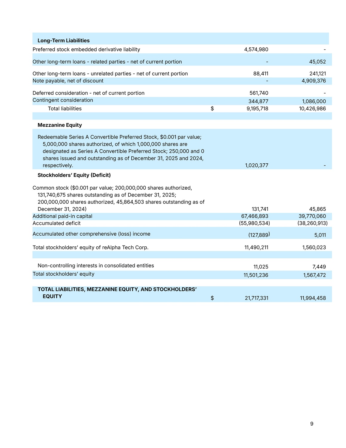 9 - 4,574,980 Preferred stock embedded derivative liability 45,052 - Other long - term loans - related parties - net of current portion 241,121 88,411 Other long - term loans - unrelated parties - net of current portion 4,909,376 - Note payable, net of discount - 561,740 Deferred consideration - net of current portion 1,086,000 344,877 Contingent consideration 10,426,986 9,195,718 $ Total liabilities Mezzanine Equity Redeemable Series A Convertible Preferred Stock, $0.001 par value; - 1,020,377 5 , 000 , 000 shares authorized, of which 1 , 000 , 000 shares are designated as Series A Convertible Preferred Stock ; 250 , 000 and 0 shares issued and outstanding as of December 31 , 2025 and 2024 , respectively . 45,865 131,741 131,740,675 shares outstanding as of December 31, 2025; 200,000,000 shares authorized, 45,864,503 shares outstanding as of December 31, 2024  39,770,060 67,466,893 Additional paid - in capital  38,260,913)  55,980,534) Accumulated deficit 5,011  127,889 ) Accumulated other comprehensive (loss) income 1,560,023 11,490,211 Total stockholdersʼ equity of reAlpha Tech Corp. 7,449 11,025 Non - controlling interests in consolidated entities 1,567,472 11,501,236 Total stockholdersʼ equity 11,994,458 21,717,331 $ TOTAL LIABILITIES, MEZZANINE EQUITY, AND STOCKHOLDERSʼ EQUITY Long - Term Liabilities Stockholdersʼ Equity  Deficit) Common stock  $0.001 par value; 200,000,000 shares authorized,