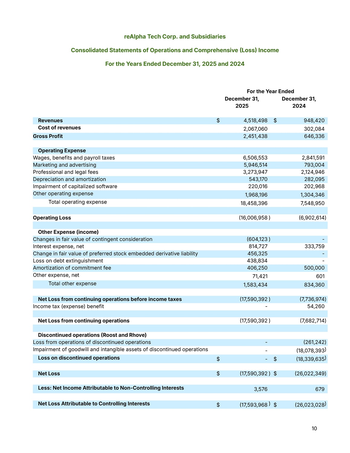 10 For the Year Ended December 31, 2024 December 31, 2025 948,420 $ 4,518,498 $ Revenues 302,084 2,067,060 Cost of revenues 646,336 2,451,438 Gross Profit Operating Expense 2,841,591 6,506,553 Wages, benefits and payroll taxes 793,004 5,946,514 Marketing and advertising 2,124,946 3,273,947 Professional and legal fees 282,095 543,170 Depreciation and amortization 202,968 220,016 Impairment of capitalized software 1,304,346 1,968,196 Other operating expense 7,548,950 18,458,396 Total operating expense )  6,902,614 )  16,006,958 Operating Loss Other Expense (income) - )  604,123 Changes in fair value of contingent consideration 333,759 814,727 Interest expense, net - 456,325 Change in fair value of preferred stock embedded derivative liability - 438,834 Loss on debt extinguishment 500,000 406,250 Amortization of commitment fee 601 71,421 Other expense, net 834,360 1,583,434 Total other expense )  7,736,974 )  17,590,392 Net Loss from continuing operations before income taxes 54,260 - Income tax (expense) benefit )  7,682,714 )  17,590,392 Net Loss from continuing operations Discontinued operations  Roost and Rhove) )  261,242 - Loss from operations of discontinued operations )  18,078,393 - Impairment of goodwill and intangible assets of discontinued operations )  18,339,635 $ - $ Loss on discontinued operations )  26,022,349 $ )  17,590,392 $ Net Loss 679 3,576 Less: Net Income Attributable to Non - Controlling Interests )  26,023,028 $ )  17,593,968 $ Net Loss Attributable to Controlling Interests reAlpha Tech Corp. and Subsidiaries Consolidated Statements of Operations and Comprehensive  Loss  Income For the Years Ended December 31, 2025 and 2024